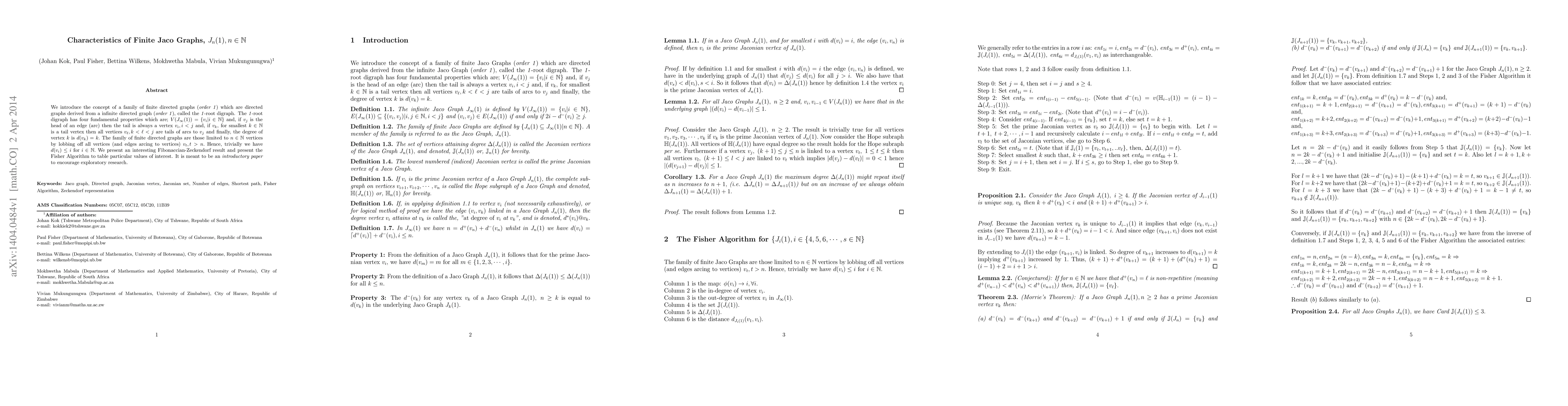 This paper introduces finite directed graphs, $J_n(1)$, derived from an infinite directed graph called the 1-root digraph, which has specific properties regarding vertex connections and degrees. The paper explores a Fibonaccian-Zeckendorf result and presents the Fisher Algorithm for analyzing these graphs.