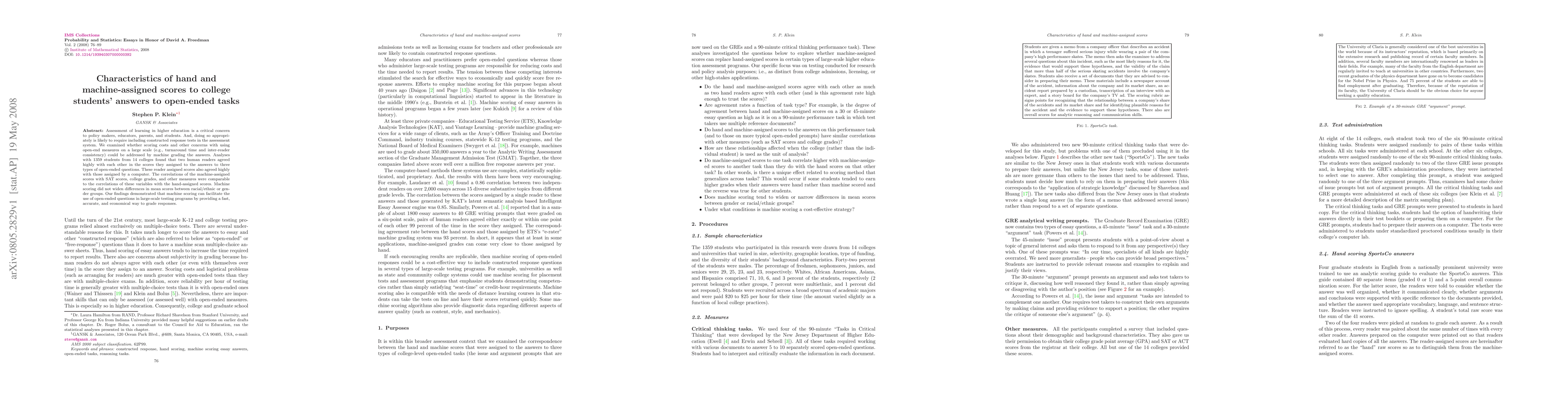 Assessment of learning in higher education is a critical concern to policy makers, educators, parents, and students. And, doing so appropriately is likely to require including constructed response tests in the assessment system. We examined whether scoring costs and other concerns with using open-end measures on a large scale (e.g., turnaround time and inter-reader consistency) could be addressed by machine grading the answers. Analyses with 1359 students from 14 colleges found that two human readers agreed highly with each other in the scores they assigned to the answers to three types of open-ended questions. These reader assigned scores also agreed highly with those assigned by a computer. The correlations of the machine-assigned scores with SAT scores, college grades, and other measures were comparable to the correlations of these variables with the hand-assigned scores. Machine scoring did not widen differences in mean scores between racial/ethnic or gender groups. Our findings demonstrated that machine scoring can facilitate the use of open-ended questions in large-scale testing programs by providing a fast, accurate, and economical way to grade responses.
