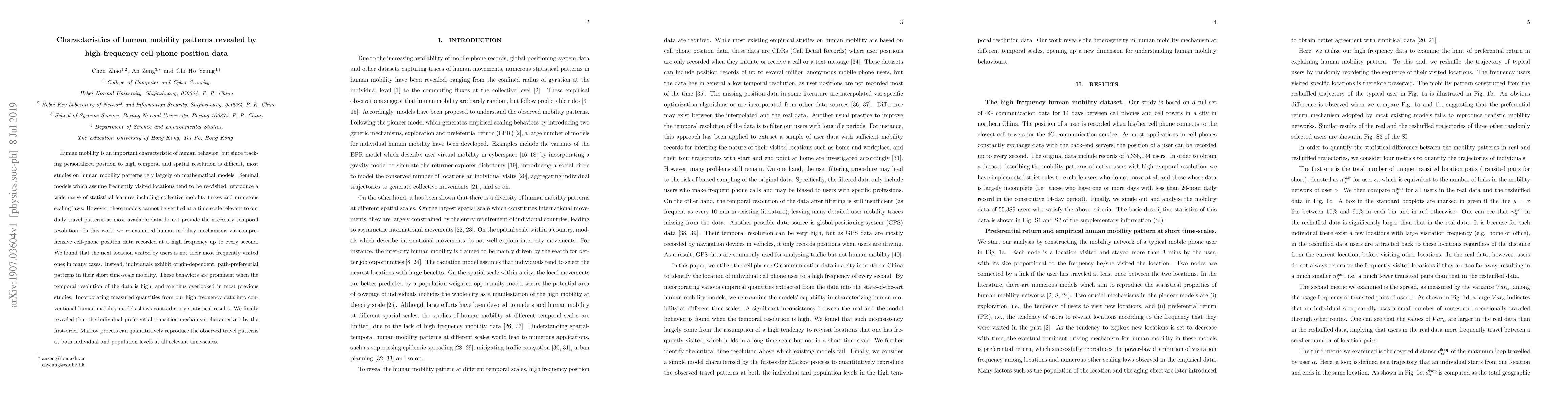This study uses high-frequency cell-phone data to reveal that human mobility patterns are characterized by origin-dependent, path-preferential behaviors rather than frequent revisits to most visited locations, challenging existing models. The first-order Markov process effectively captures these observed travel patterns across different time scales.