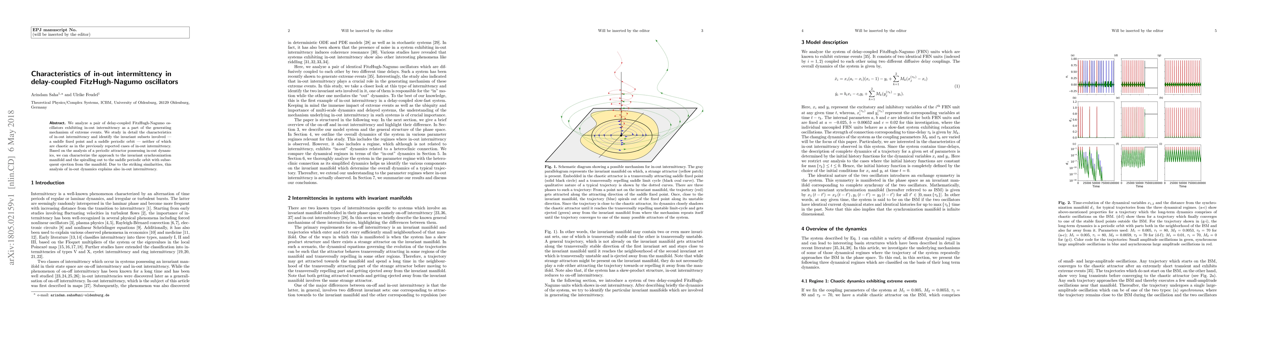 We analyze a pair of delay-coupled FitzHugh-Nagumo oscillators exhibiting in-out intermittency as a part of the generating mechanism of extreme events. We study in detail the characteristics of in-out intermittency and identify the invariant subsets involved --- a saddle fixed point and a saddle periodic orbit --- neither of which are chaotic as in the previously reported cases of in-out intermittency. Based on the analysis of a periodic attractor possessing in-out dynamics, we can characterize the approach to the invariant synchronization manifold and the spiralling out to the saddle periodic orbit with subsequent ejection from the manifold. Due to the striking similarities, this analysis of in-out dynamics explains also in-out intermittency.