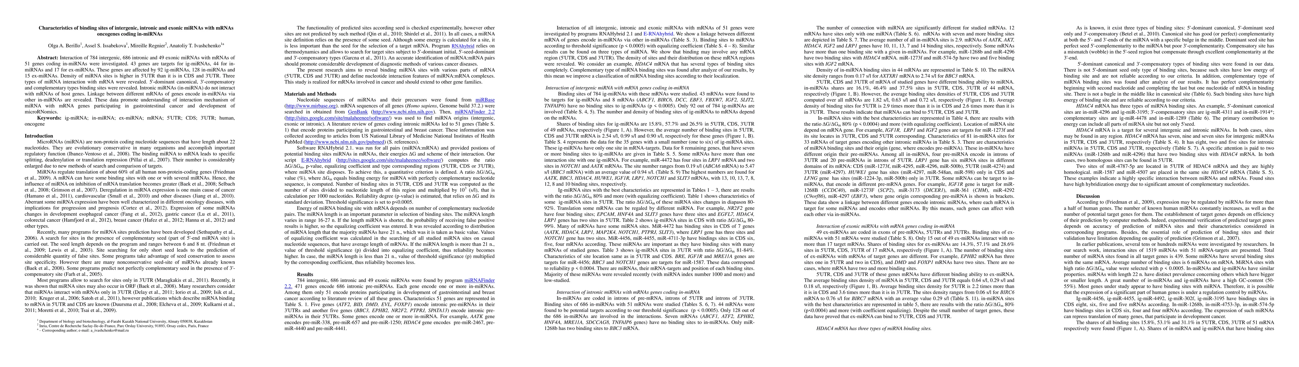 Regulatory relationships of 686 intronic miRNA and 784 intergenic miRNAs with mRNAs of 51 intronic miRNA coding genes were established. Interaction features of studied miRNAs with 5'UTR, CDS and 3'UTR of mRNA of each gene were revealed. Functional regions of mRNA were shown to be significantly heterogenous according to the number of binding sites of miRNA and to the location density of these sites.