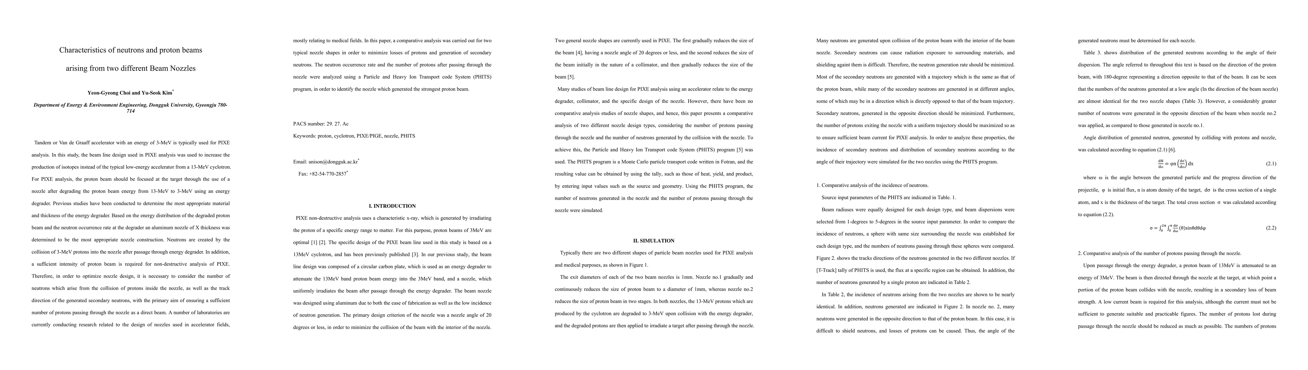 Tandem or Van de Graaff accelerator with an energy of 3-MeV is typically used for PIXE analysis. In this study, the beam line design used in PIXE analysis was used to increase the production of isotopes instead of the typical low-energy accelerator from a 13-MeV cyclotron. For PIXE analysis, the proton beam should be focused at the target through the use of a nozzle after degrading the proton beam energy from 13-MeV to 3-MeV using an energy degrader. Previous studies have been conducted to determine the most appropriate material and thickness of the energy degrader. Based on the energy distribution of the degraded proton beam and the neutron occurrence rate at the degrader an aluminum nozzle of X thickness was determined to be the most appropriate nozzle construction. Neutrons are created by the collision of 3-MeV protons into the nozzle after passage through energy degrader. In addition, a sufficient intensity of proton beam is required for non-destructive analysis of PIXE. Therefore, in order to optimize nozzle design, it is necessary to consider the number of neutrons which arise from the collision of protons inside the nozzle, as well as the track direction of the generated secondary neutrons, with the primary aim of ensuring a sufficient number of protons passing through the nozzle as a direct beam. A number of laboratories are currently conducting research related to the design of nozzles used in accelerator fields, mostly relating to medical fields. In this paper, a comparative analysis was carried out for two typical nozzle shapes in order to minimize losses of protons and generation of secondary neutrons. The neutron occurrence rate and the number of protons after passing through the nozzle were analyzed using a Particle and Heavy Ion Transport code System (PHITS) program, in order to identify the nozzle which generated the strongest proton beam.