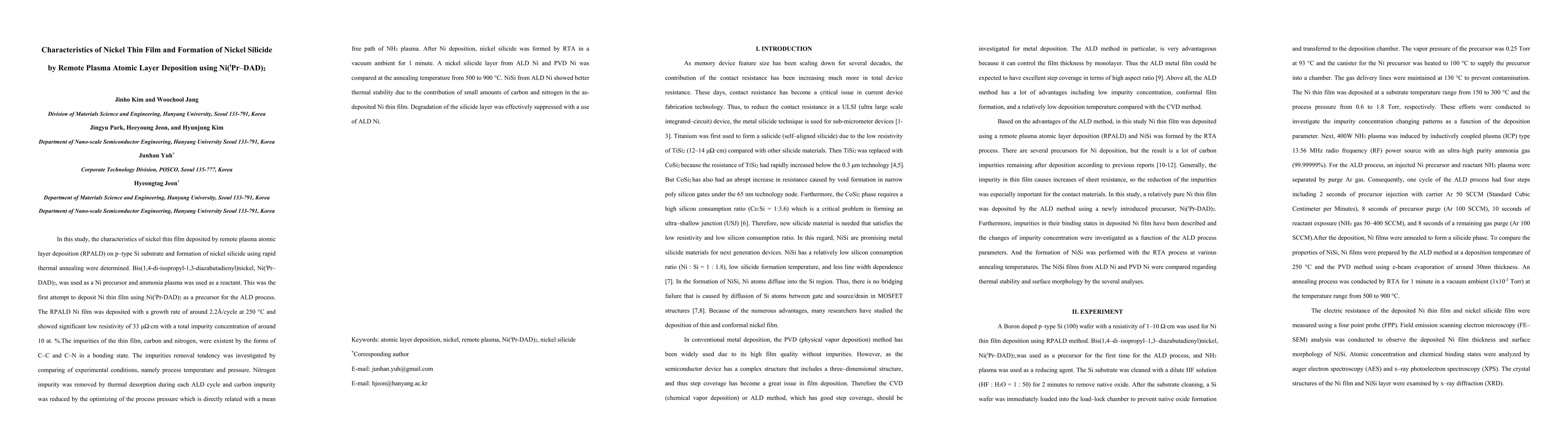 This study investigates nickel thin film deposition via remote plasma atomic layer deposition (RPALD) using Ni(iPr-DAD)2 on p-type Si, achieving a low resistivity of 33 μΩcm. Nickel silicide formation through rapid thermal annealing exhibited superior thermal stability compared to PVD Ni, owing to residual carbon and nitrogen in the deposited film.
