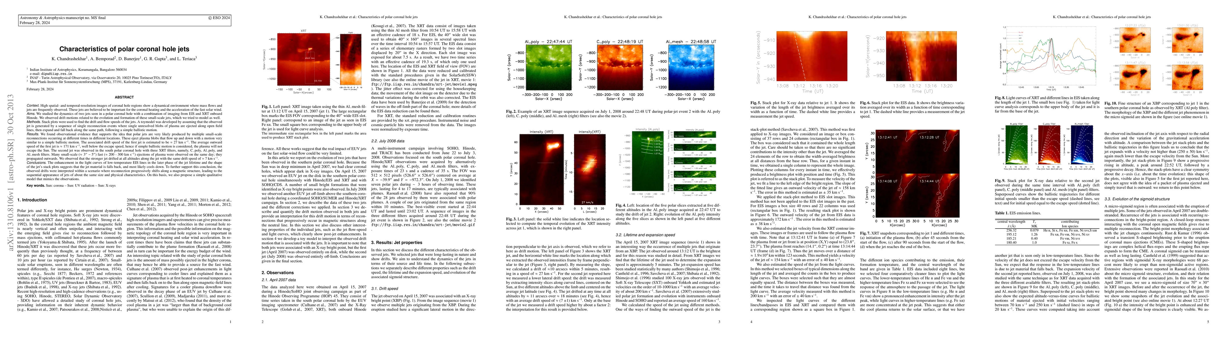 This study investigates the dynamics of jets in polar coronal holes using Hinode's EIS and XRT imaging, finding evidence for multiple reconnections producing small-scale jets. The first jet's drift speed is approximately 27 km s$^{-1}$, while the second jet exhibits a consistent drift speed of 7 km s$^{-1}$, suggesting material falls back and cools down.