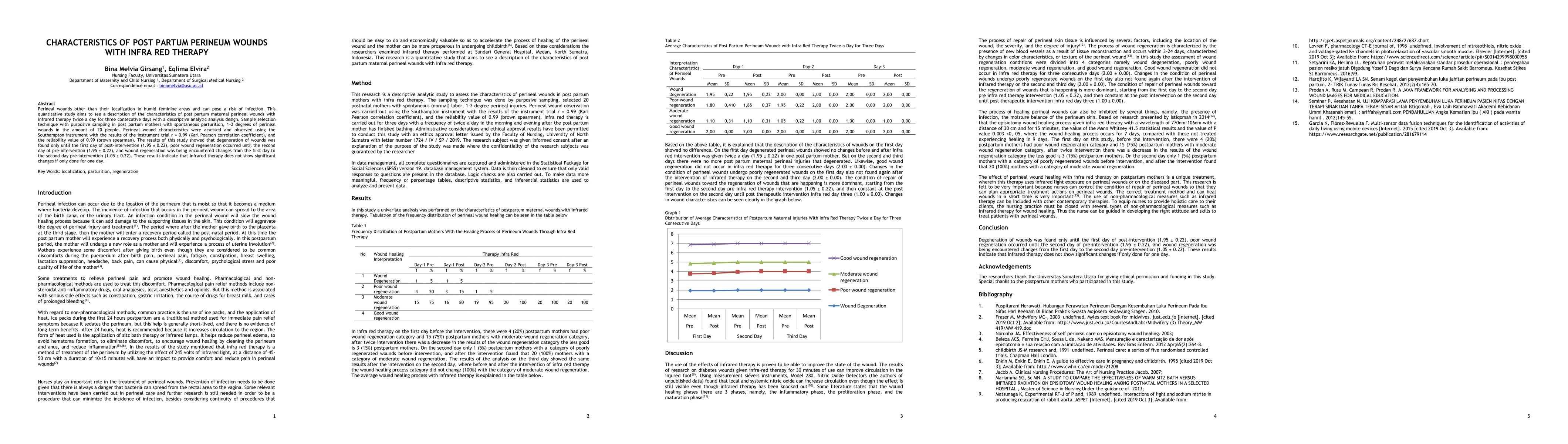 This study quantitatively examines the characteristics of post-partum perineal wounds treated with infrared therapy twice daily for three days. Findings indicate minimal wound regeneration benefits from infrared therapy when applied for only one day.