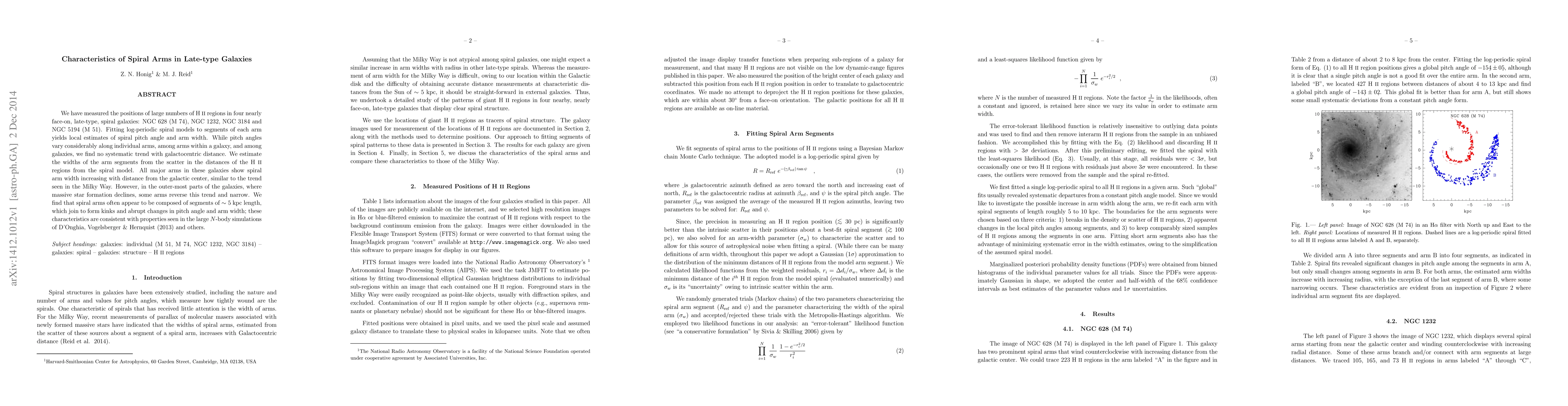 We have measured the positions of large numbers of H II regions in four nearly face-on, late-type, spiral galaxies: NGC 628 (M 74), NGC 1232, NGC 3184 and NGC 5194 (M 51). Fitting log-periodic spiral models to segments of each arm yields local estimates of spiral pitch angle and arm width. While pitch angles vary considerably along individual arms, among arms within a galaxy, and among galaxies, we find no systematic trend with galactocentric distance. We estimate the widths of the arm segments from the scatter in the distances of the H II regions from the spiral model. All major arms in these galaxies show spiral arm width increasing with distance from the galactic center, similar to the trend seen in the Milky Way. However, in the outer-most parts of the galaxies, where massive star formation declines, some arms reverse this trend and narrow. We find that spiral arms often appear to be composed of segments of ~5 kpc length, which join to form kinks and abrupt changes in pitch angle and arm width; these characteristics are consistent with properties seen in the large N-body simulations of D'Onghia, Vogelsberger and Hernquist (2013) and others.