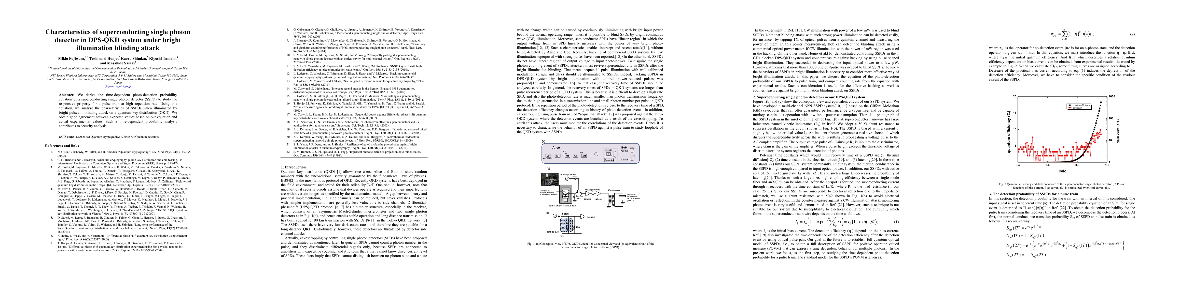 This paper derives a time-dependent photo-detection probability equation for superconducting single photon detectors (SSPDs) to analyze their response under high repetition rate pulse trains. It examines SSPD characteristics under bright illumination in blinding attacks on quantum key distribution systems, showing good agreement between theoretical and experimental results, thus contributing to security analysis.