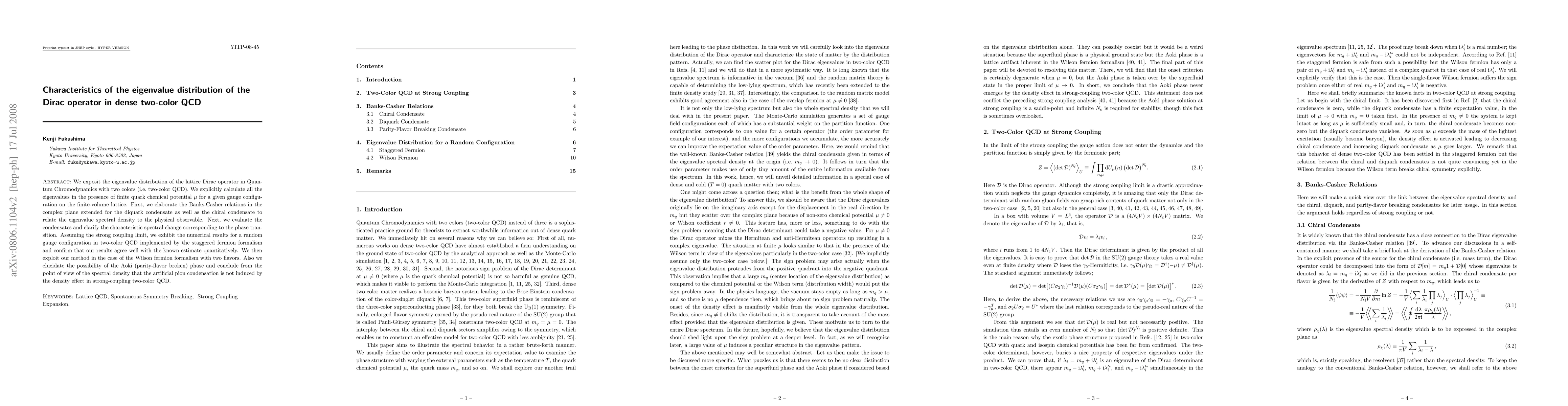 We exposit the eigenvalue distribution of the lattice Dirac operator in Quantum Chromodynamics with two colors (i.e. two-color QCD). We explicitly calculate all the eigenvalues in the presence of finite quark chemical potential \mu for a given gauge configuration on the finite-volume lattice. First, we elaborate the Banks-Casher relations in the complex plane extended for the diquark condensate as well as the chiral condensate to relate the eigenvalue spectral density to the physical observable. Next, we evaluate the condensates and clarify the characteristic spectral change corresponding to the phase transition. Assuming the strong coupling limit, we exhibit the numerical results for a random gauge configuration in two-color QCD implemented by the staggered fermion formalism and confirm that our results agree well with the known estimate quantitatively. We then exploit our method in the case of the Wilson fermion formalism with two flavors. Also we elucidate the possibility of the Aoki (parity-flavor broken) phase and conclude from the point of view of the spectral density that the artificial pion condensation is not induced by the density effect in strong-coupling two-color QCD.