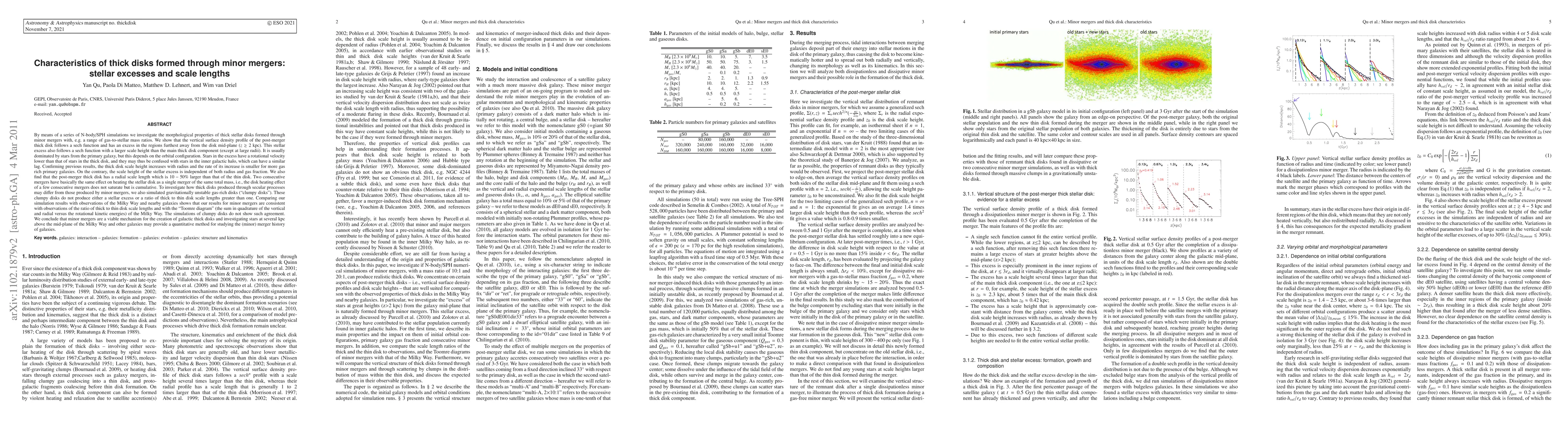 This paper uses N-body/SPH simulations to explore the formation of thick disks via minor mergers, finding that they exhibit a sech function profile with a stellar excess far from the mid-plane. The excess has a larger scale height and stars with lower rotational velocities, potentially resembling inner galactic halo stars.