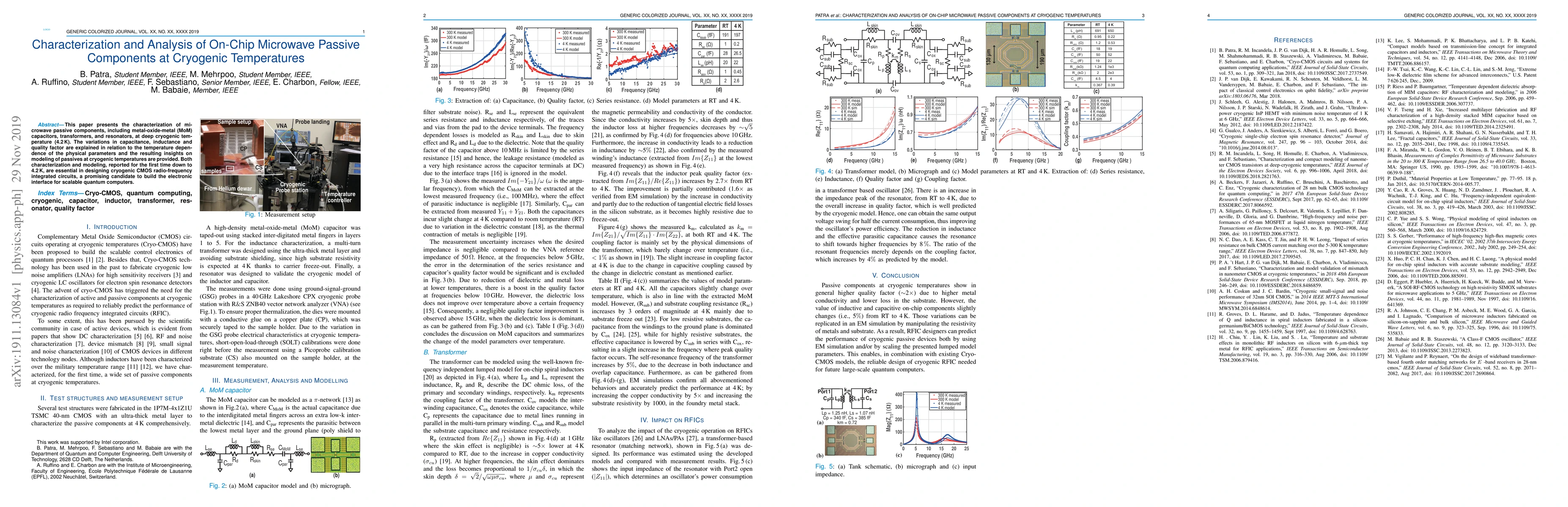 This paper characterizes microwave passive components at cryogenic temperatures, revealing temperature-dependent variations in capacitance, inductance, and quality factor. The findings provide new insights into modeling these components for cryogenic CMOS radio-frequency integrated circuits, crucial for quantum computing interfaces.