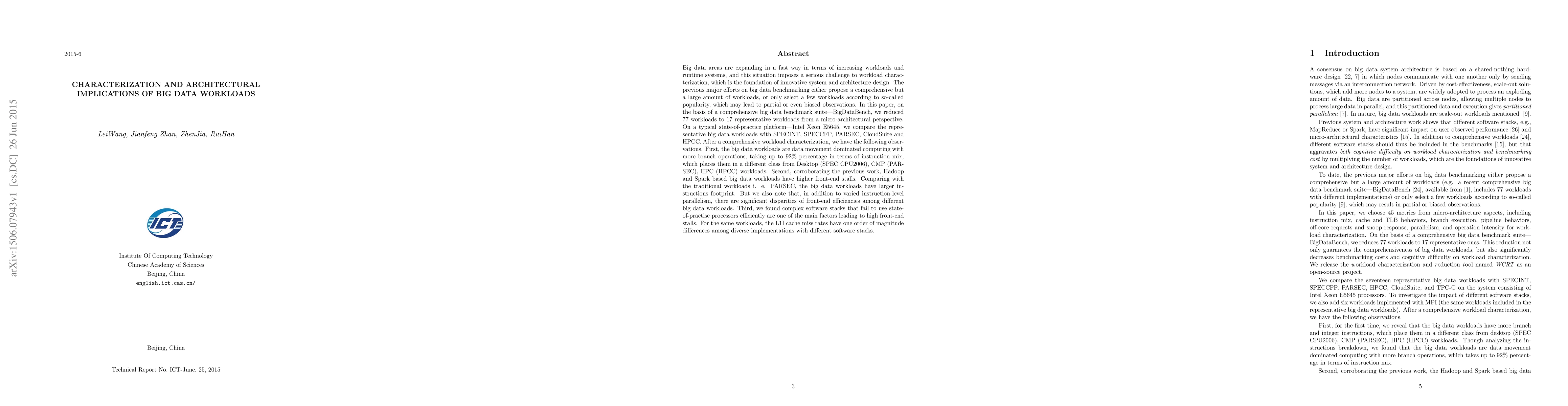 This paper characterizes big data workloads from a micro-architectural perspective, identifying 17 representative workloads from a comprehensive suite. The study reveals that big data workloads are data-movement dominated, with high branch operation rates, and exhibit significant disparities in front-end efficiency, often resulting in higher front-end stalls compared to traditional workloads.