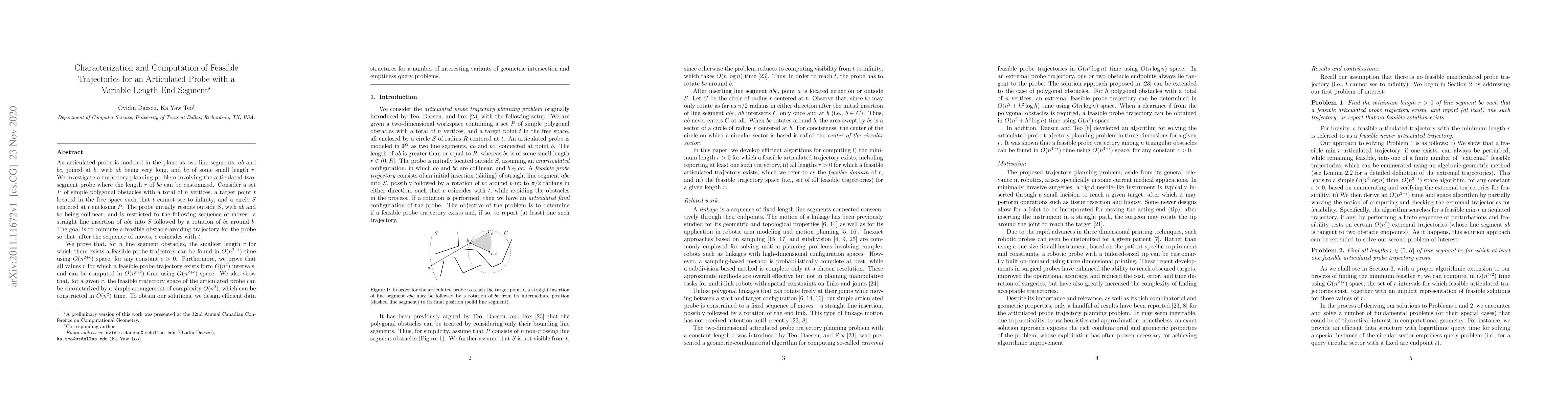 An articulated probe is modeled in the plane as two line segments, $ab$ and $bc$, joined at $b$, with $ab$ being very long, and $bc$ of some small length $r$. We investigate a trajectory planning problem involving the articulated two-segment probe where the length $r$ of $bc$ can be customized. Consider a set $P$ of simple polygonal obstacles with a total of $n$ vertices, a target point $t$ located in the free space such that $t$ cannot see to infinity, and a circle $S$ centered at $t$ enclosing $P$. The probe initially resides outside $S$, with $ab$ and $bc$ being collinear, and is restricted to the following sequence of moves: a straight line insertion of $abc$ into $S$ followed by a rotation of $bc$ around $b$. The goal is to compute a feasible obstacle-avoiding trajectory for the probe so that, after the sequence of moves, $c$ coincides with $t$. We prove that, for $n$ line segment obstacles, the smallest length $r$ for which there exists a feasible probe trajectory can be found in $O(n^{2+\epsilon})$ time using $O(n^{2+\epsilon})$ space, for any constant $\epsilon > 0$. Furthermore, we prove that all values $r$ for which a feasible probe trajectory exists form $O(n^2)$ intervals, and can be computed in $O(n^{5/2})$ time using $O(n^{2+\epsilon})$ space. We also show that, for a given $r$, the feasible trajectory space of the articulated probe can be characterized by a simple arrangement of complexity $O(n^2)$, which can be constructed in $O(n^2)$ time. To obtain our solutions, we design efficient data structures for a number of interesting variants of geometric intersection and emptiness query problems.