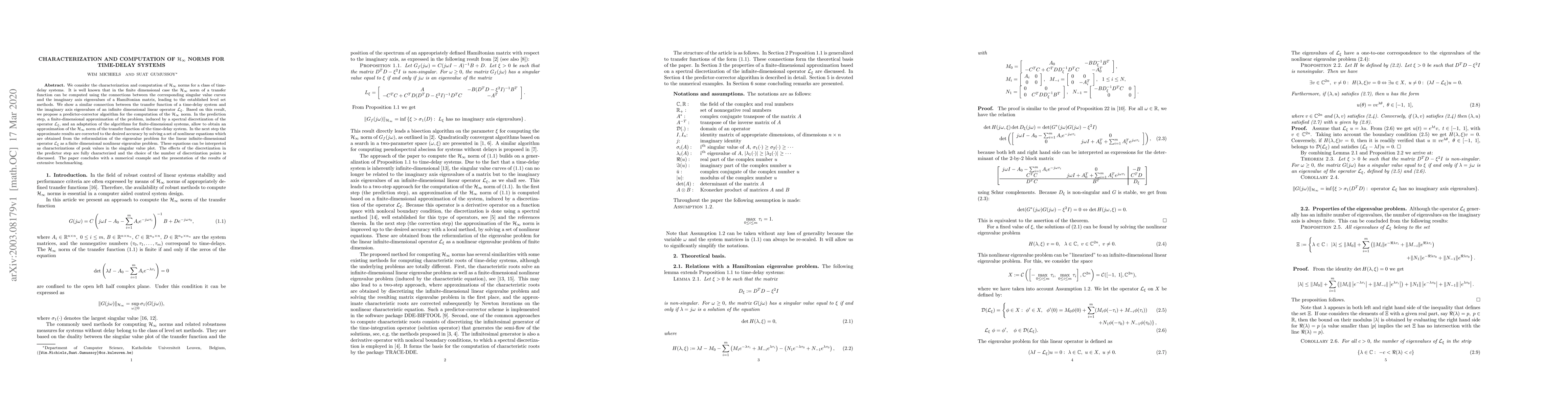 We consider the characterization and computation of H-infinity norms for a class of time-delay systems. It is well known that in the finite dimensional case the H-infinity norm of a transfer function can be computed using the connections between the corresponding singular value curves and the imaginary axis eigenvalues of a Hamiltonian matrix, leading to the established level set methods. We show a similar connection between the transfer function of a time-delay system and the imaginary axis eigenvalues of an infinite dimensional linear operator $\mathcal{L}_{\xi}^N$. Based on this result, we propose a predictor-corrector algorithm for the computation of the H-infinity norm. In the prediction step, a finite-dimensional approximation of the problem, induced by a spectral discretization of the operator $\mathcal{L}_{\xi}$, and an adaptation of the algorithms for finite-dimensional systems, allow to obtain an approximation of the H-infinity norm of the transfer function of the time-delay system. In the next step the approximate results are corrected to the desired accuracy by solving a set of nonlinear equations which are obtained from the reformulation of the eigenvalue problem for the linear infinite-dimensional operator $\mathcal{L}_{\xi}^N$ as a finite dimensional nonlinear eigenvalue problem. These equations can be interpreted as characterizations of peak values in the singular value plot. The effects of the discretization in the predictor step are fully characterized and the choice of the number of discretization points is discussed. The paper concludes with a numerical example and the presentation of the results of extensive benchmarking.