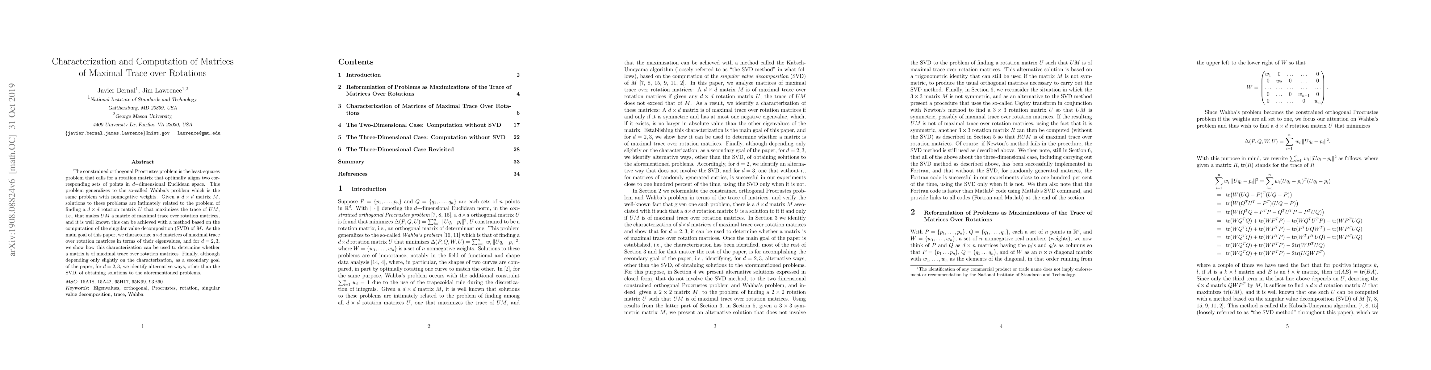 The constrained orthogonal Procrustes problem is the least-squares problem that calls for a rotation matrix that optimally aligns two corresponding sets of points in d-dimensional Euclidean space. This problem generalizes to the so-called Wahba's problem which is the same problem with nonnegative weights. Given a dxd matrix M, solutions to these problems are intimately related to the problem of finding a dxd rotation matrix U that maximizes the trace of UM, i.e., that makes UM a matrix of maximal trace over rotations, and it is well known this can be achieved with a method based on the computation of the singular value decomposition (SVD) of M. As the main goal of this paper, we characterize dxd matrices of maximal trace over rotation matrices in terms of their eigenvalues, and for d = 2, 3, we show how this characterization can be used to determine whether a matrix is of maximal trace over rotation matrices. Finally, although depending only slightly on the characterization, as a secondary goal of the paper, for d = 2, 3, we identify alternative ways, other than the SVD, of obtaining solutions to the aforementioned problems.