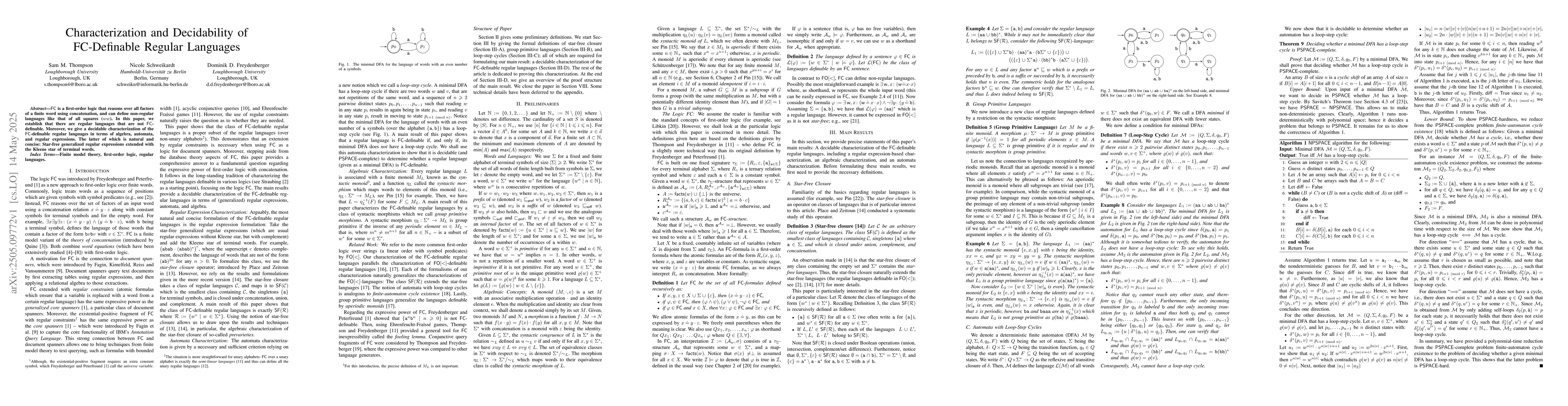 The paper employs techniques from formal language theory, first-order logic, and automata theory to characterize FC-definable regular languages.