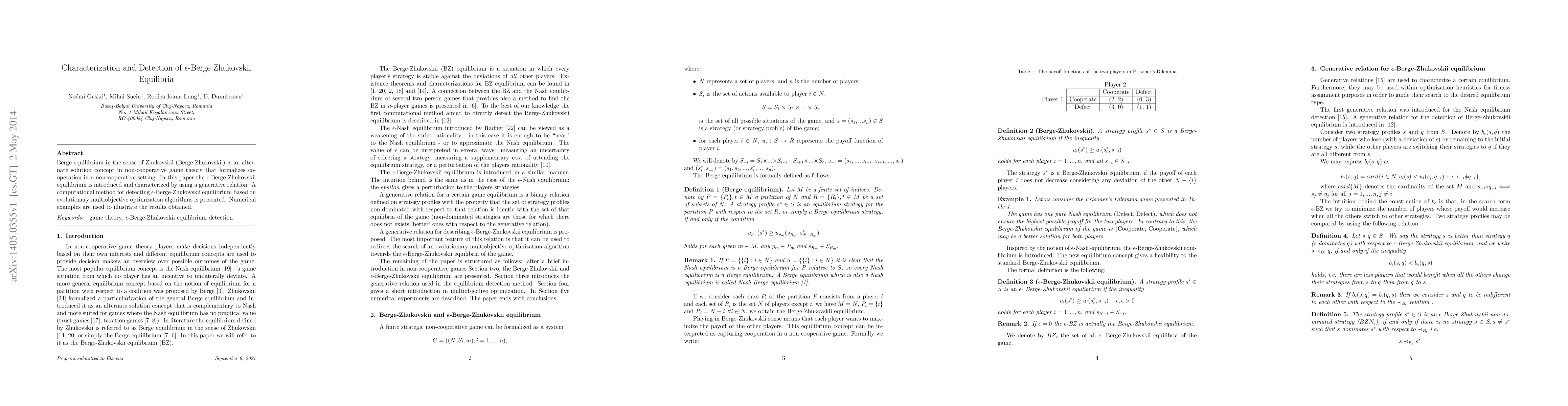 Berge equilibrium in the sense of Zhukovskii (Berge-Zhukovskii) is an alternate solution concept in non-cooperative game theory that formalizes cooperation in a noncooperative setting. In this paper the epsilon-Berge-Zhukovskii equilibrium is introduced and characterized by using a generative relation. A computational method for detecting epsilon-Berge-Zhukovskii equilibrium based on evolutionary multiobjective optimization algorithms is presented. Numerical examples are used to illustrate the results obtained.