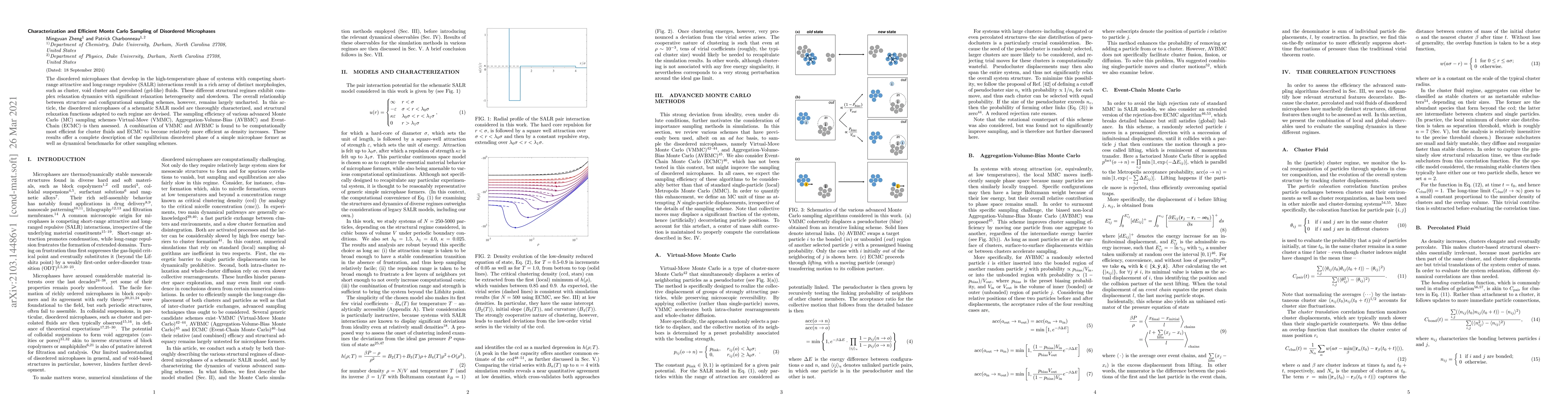 Researchers characterized disordered microphases in a SALR model, devised structural relaxation functions for distinct morphologies, and assessed the efficiency of various Monte Carlo sampling schemes, finding that a combination of Virtual-Move and Aggregation-Volume-Bias methods is most efficient for cluster fluids.