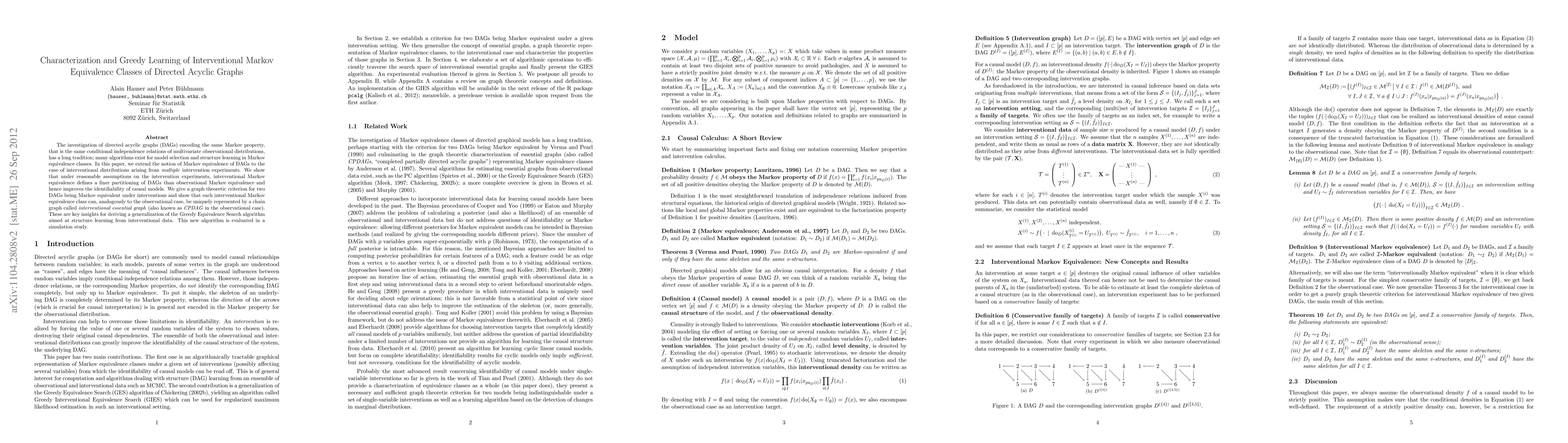 This paper extends Markov equivalence to interventional distributions from multiple experiments, showing that it provides a finer partitioning of DAGs, enhancing causal model identifiability. It introduces a new graph theoretic criterion and a Greedy Equivalence Search algorithm for learning from interventional data, evaluated through simulations.