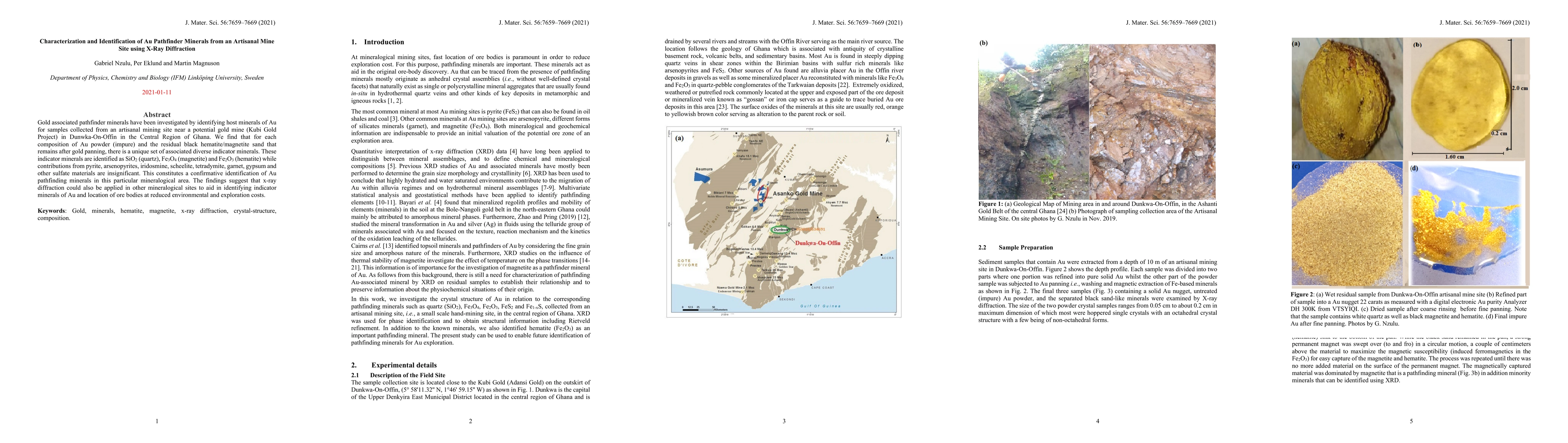 This study investigates gold-associated pathfinder minerals in samples from an artisanal mine in Ghana using X-ray diffraction, identifying quartz, magnetite, and hematite as key indicator minerals. The findings suggest X-ray diffraction can aid in identifying Au-related minerals and locating ore bodies with lower environmental and exploration costs.