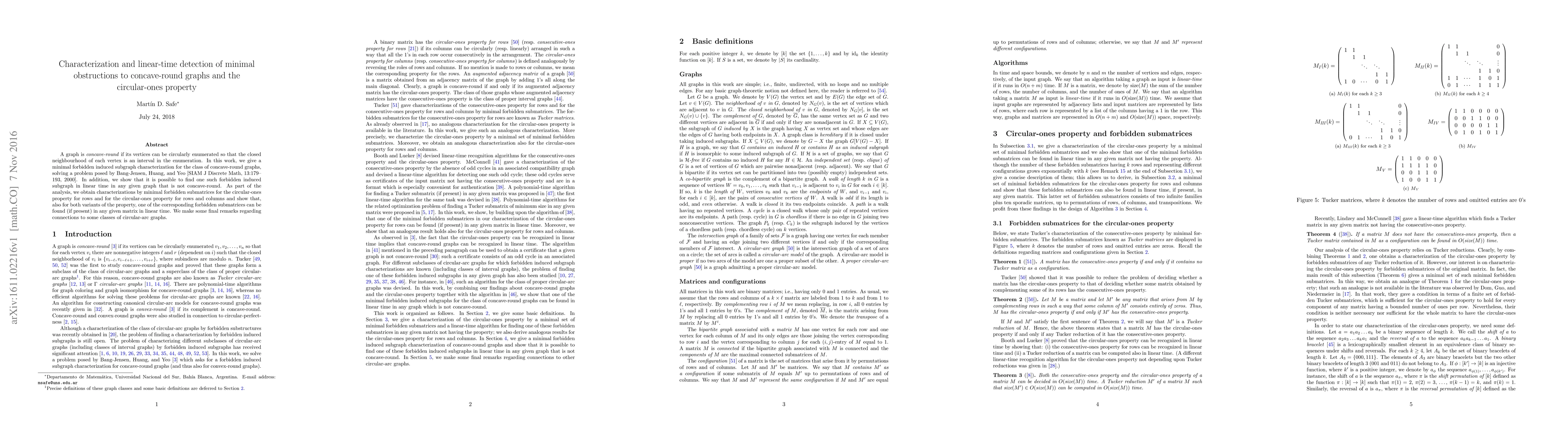 This research paper characterizes minimal obstructions to concave-round graphs and finds linear-time detection methods for these obstructions. It also explores the circular-ones property and its related submatrices in circular-arc graphs.