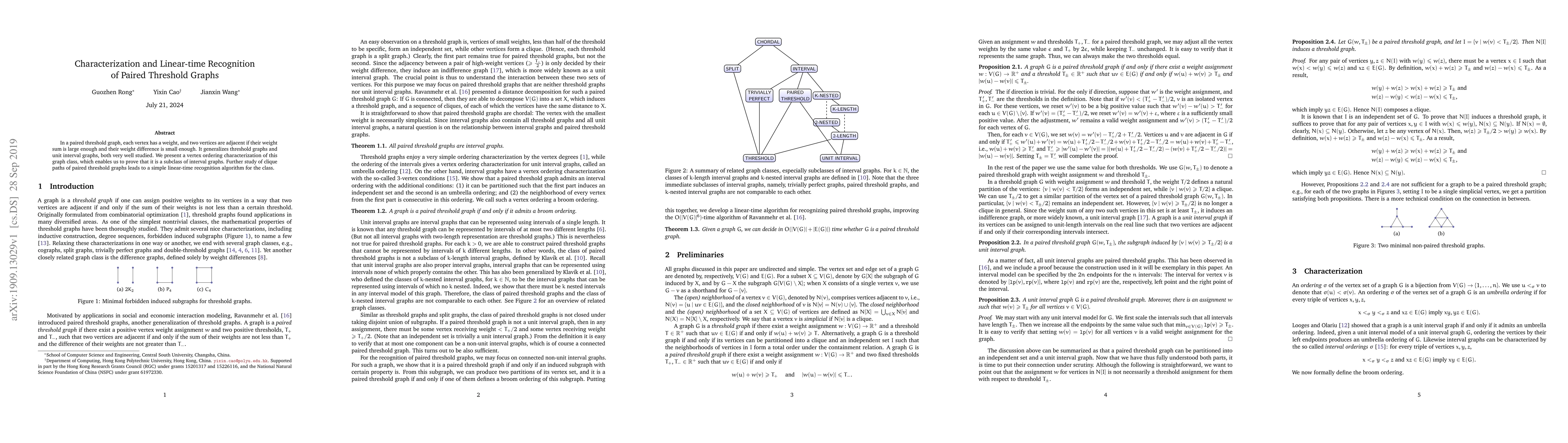 This paper characterizes paired threshold graphs, showing they are a subclass of interval graphs via a vertex ordering method. It also develops a linear-time recognition algorithm for this graph class based on the study of clique paths.