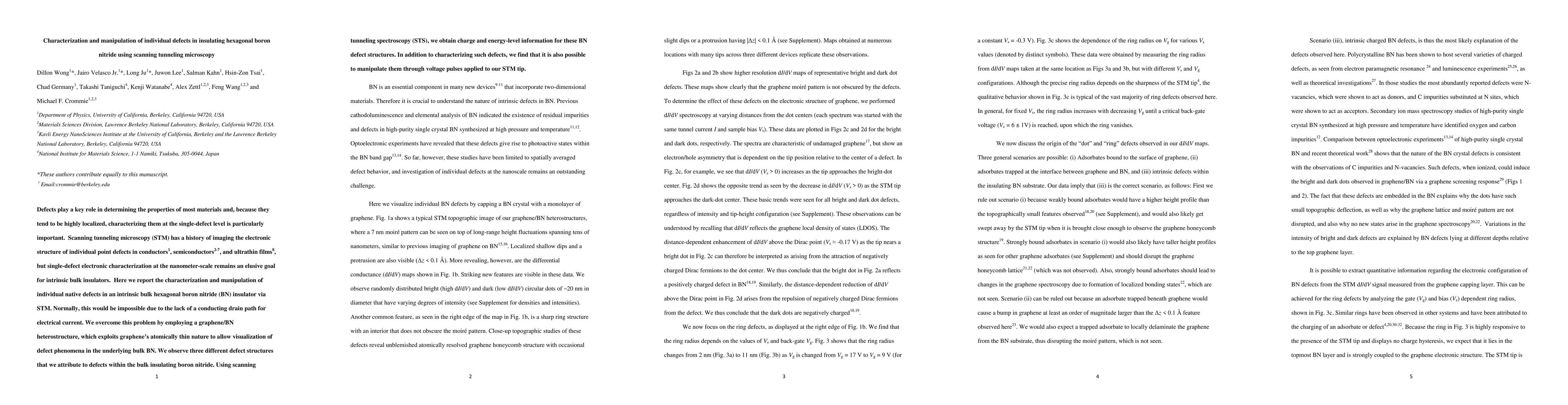 This paper reports the successful characterization and manipulation of individual native defects in bulk hexagonal boron nitride (BN) using scanning tunneling microscopy (STM) facilitated by a graphene/BN heterostructure. The study identifies three distinct defect structures and provides charge and energy-level information via scanning tunneling spectroscopy (STS), along with demonstrating the ability to manipulate these defects with voltage pulses.