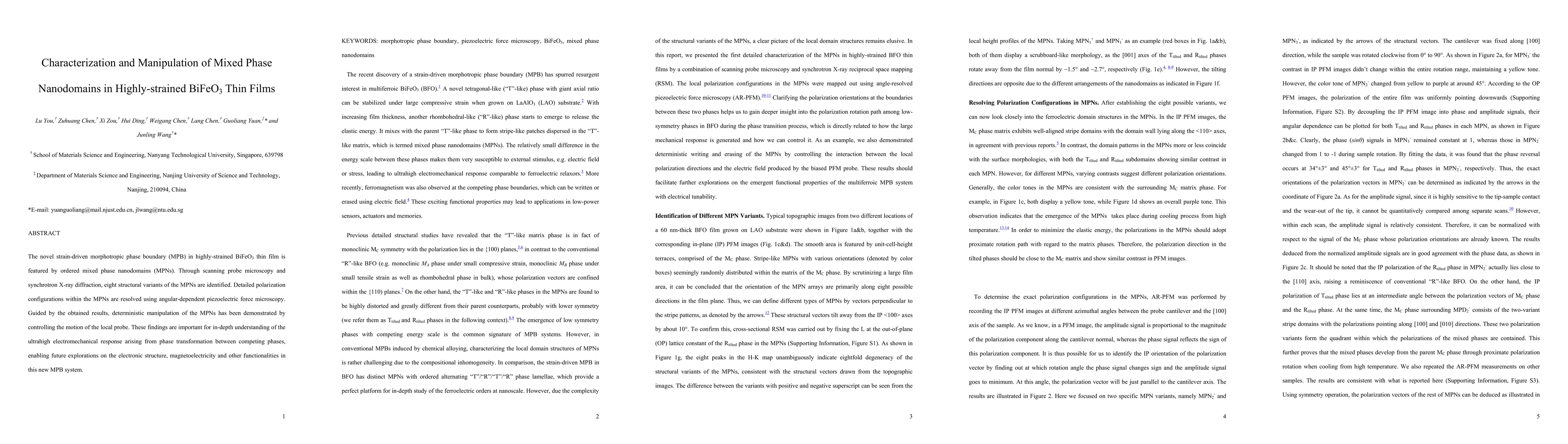 This paper characterizes mixed phase nanodomains in highly-strained BiFeO3 thin films, identifying eight structural variants via microscopy and diffraction techniques. It also demonstrates the manipulation of these domains using a local probe, which is crucial for understanding the material's electromechanical response and potential applications in electronics.
