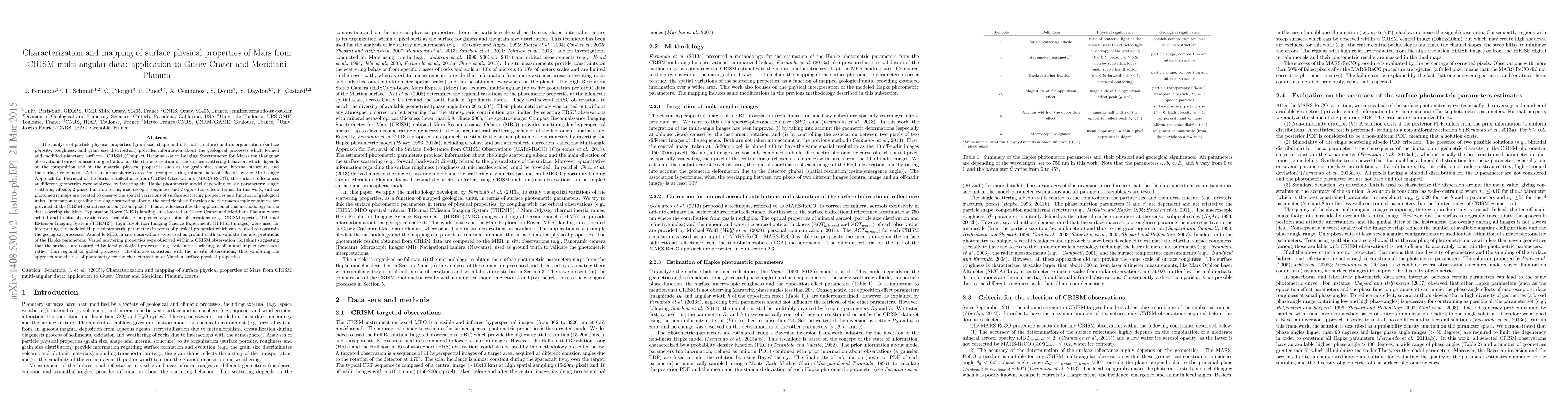 This paper uses CRISM multi-angular data to characterize and map the surface physical properties of Mars, focusing on Gusev Crater and Meridiani Planum. The study employs atmospheric correction and the Hapke photometric model to analyze surface scattering behavior, revealing spatial variations in scattering properties linked to local geological processes.