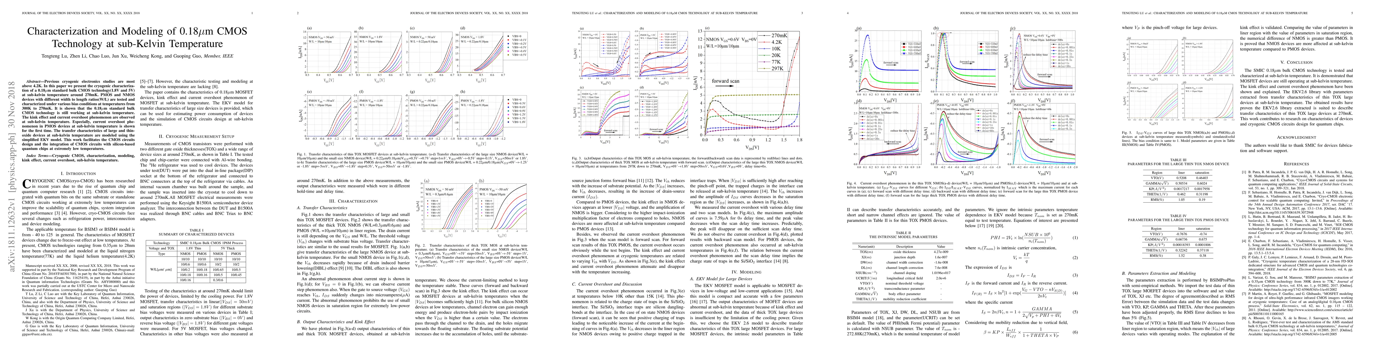 This paper characterizes a 0.18μm CMOS technology at sub-kelvin temperatures around 270mK, observing the kink effect and current overshoot phenomena, particularly in PMOS devices. The EKV model is used to model transfer characteristics, aiding in CMOS circuit design at extreme low temperatures.