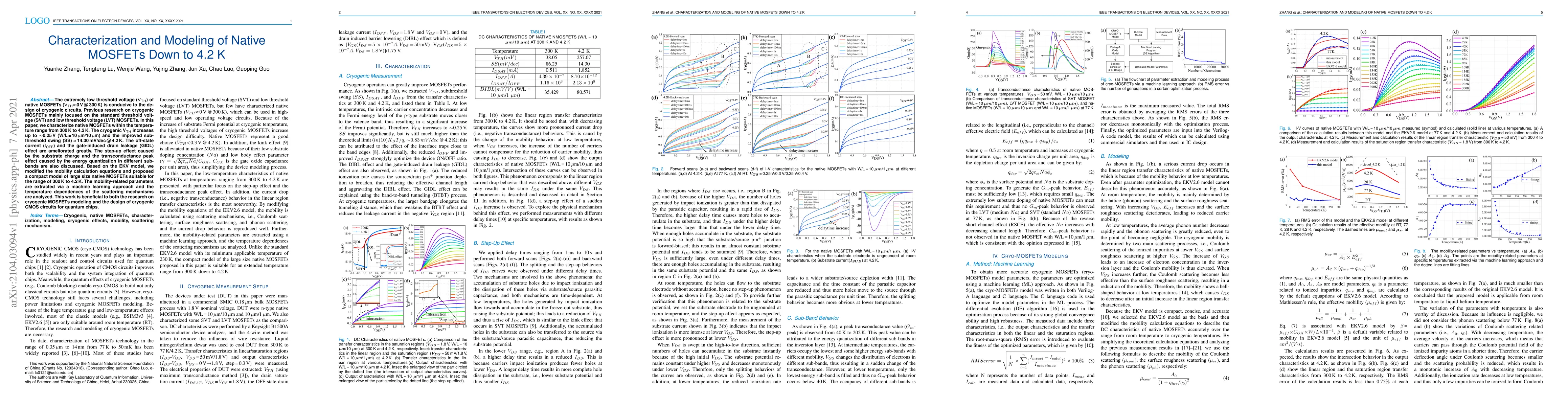 The extremely low threshold voltage (Vth) of native MOSFETs (Vth~0V@300K) is conducive to the design of cryogenic circuits. Previous research on cryogenic MOSFETs mainly focused on the standard threshold voltage (SVT) and low threshold voltage (LVT) MOSFETs. In this paper, we characterize native MOSFETs within the temperature range from 300K to 4.2K. The cryogenic Vth increases up to ~0.25V (W/L=10um/10um) and the improved subthreshold swing (SS)~14.30mV/[email protected]. The off-state current (Ioff) and the gate-induced drain leakage (GIDL) effect are ameliorated greatly. The step-up effect caused by the substrate charge and the transconductance peak effect caused by the energy quantization in different sub-bands are also discussed. Based on the EKV model, we modified the mobility calculation equations and proposed a compact model of large size native MOSFETs suitable for the range of 300K to 4.2K. The mobility-related parameters are extracted via a machine learning approach and the temperature dependences of the scattering mechanisms are analyzed. This work is beneficial to both the research on cryogenic MOSFETs modeling and the design of cryogenic CMOS circuits for quantum chips.