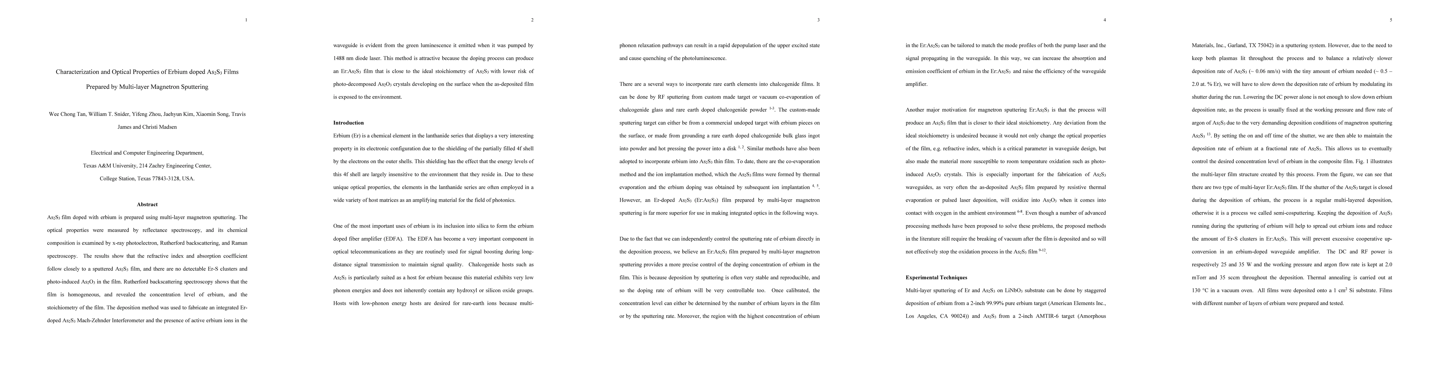 This study characterizes erbium-doped As2S3 films prepared via multi-layer magnetron sputtering, revealing their optical properties and chemical composition. The method produces films with ideal stoichiometry and low risk of photo-decomposition, demonstrated by integrated Mach-Zehnder Interferometer emitting green luminescence from active erbium ions.