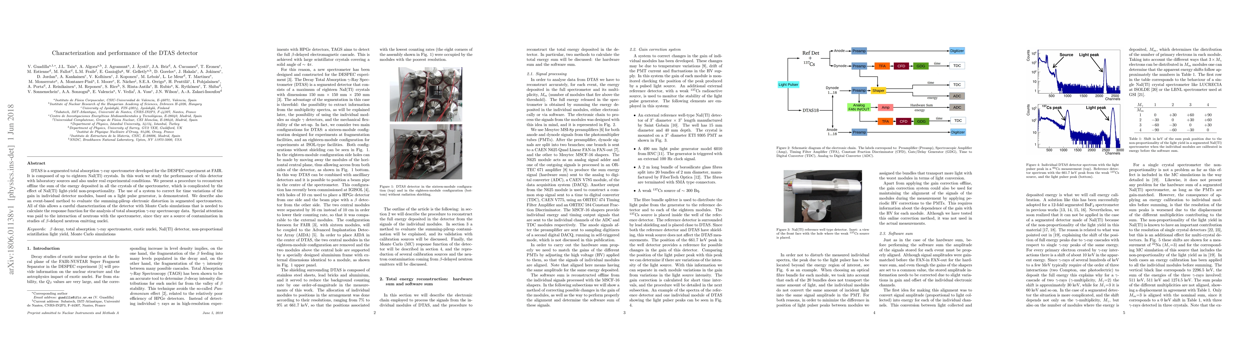 DTAS is a segmented total absorption {\gamma}-ray spectrometer developed for the DESPEC experiment at FAIR. It is composed of up to eighteen NaI(Tl) crystals. In this work we study the performance of this detector with laboratory sources and also under real experimental conditions. We present a procedure to reconstruct offline the sum of the energy deposited in all the crystals of the spectrometer, which is complicated by the effect of NaI(Tl) light-yield non-proportionality. The use of a system to correct for time variations of the gain in individual detector modules, based on a light pulse generator, is demonstrated. We describe also an event-based method to evaluate the summing-pileup electronic distortion in segmented spectrometers. All of this allows a careful characterization of the detector with Monte Carlo simulations that is needed to calculate the response function for the analysis of total absorption {\gamma}-ray spectroscopy data. Special attention was paid to the interaction of neutrons with the spectrometer, since they are a source of contamination in studies of \b{eta}-delayed neutron emitting nuclei.