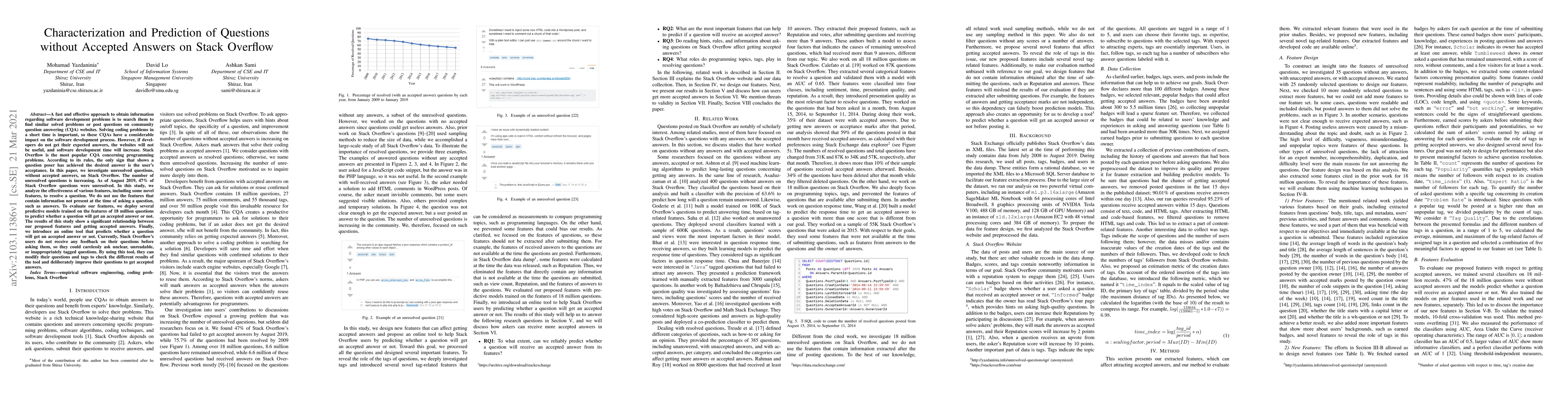 This paper investigates unresolved questions on Stack Overflow, analyzing features to predict whether a question will receive an accepted answer. The study finds a significant relationship between proposed features and answer acceptance, introducing an online tool to help users improve their questions before posting.