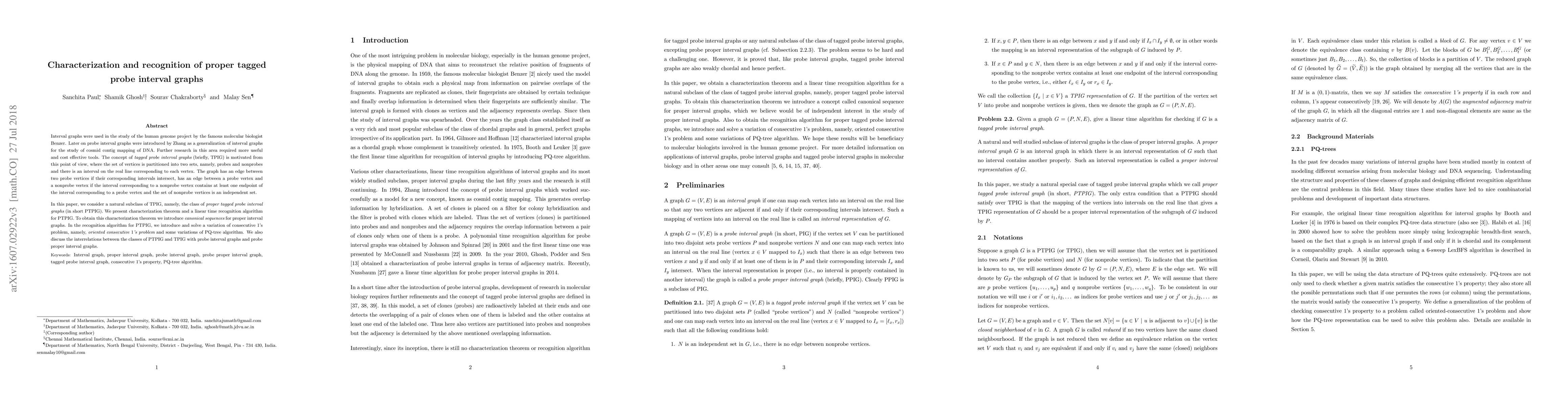 Interval graphs were used in the study of genomics by the famous molecular biologist Benzer. Later on probe interval graphs were introduced by Zhang as a generalization of interval graphs for the study of cosmid contig mapping of DNA. A tagged probe interval graph (briefly, TPIG) is motivated by similar applications to genomics, where the set of vertices is partitioned into two sets, namely, probes and nonprobes and there is an interval on the real line corresponding to each vertex. The graph has an edge between two probe vertices if their corresponding intervals intersect, has an edge between a probe vertex and a nonprobe vertex if the interval corresponding to a nonprobe vertex contains at least one end point of the interval corresponding to a probe vertex and the set of non-probe vertices is an independent set. This class of graphs have been defined nearly two decades ago, but till today there is no known recognition algorithm for it. In this paper, we consider a natural subclass of TPIG, namely, the class of proper tagged probe interval graphs (in short PTPIG). We present characterization and a linear time recognition algorithm for PTPIG. To obtain this characterization theorem we introduce a new concept called canonical sequence for proper interval graphs, which, we belief, has an independent interest in the study of proper interval graphs. Also to obtain the recognition algorithm for PTPIG, we introduce and solve a variation of consecutive $1$'s problem, namely, oriented consecutive $1$'s problem and some variations of PQ-tree algorithm. We also discuss the interrelations between the classes of PTPIG and TPIG with probe interval graphs and probe proper interval graphs.