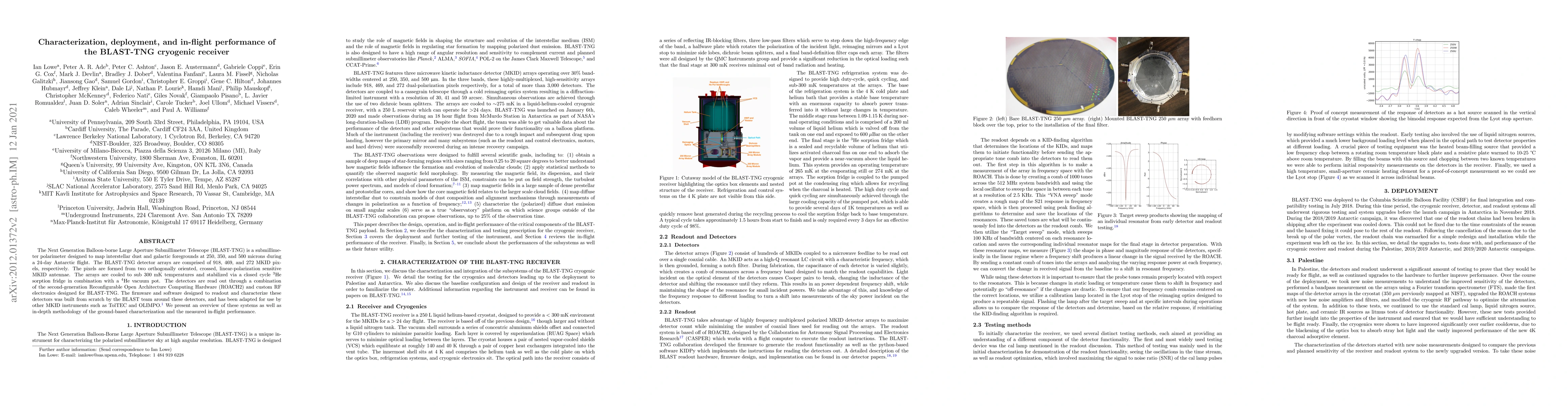 This paper details the design, deployment, and performance of the BLAST-TNG cryogenic receiver, a submillimeter polarimeter for mapping interstellar dust, featuring 918, 469, and 272 MKID pixels cooled to sub 300mK, and its successful in-flight operation during a 24-day Antarctic flight. The custom readout hardware and software developed for this mission have also been adapted for other MKID instruments.