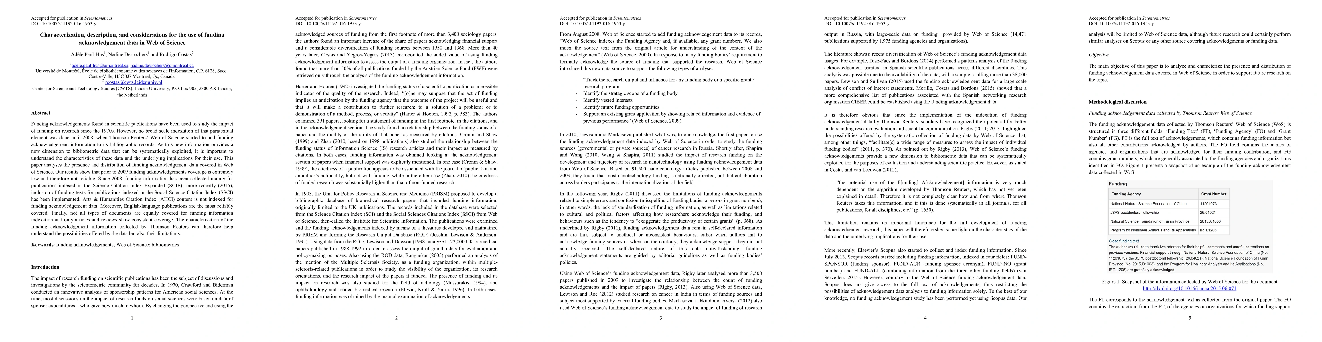 This paper analyzes the coverage and characteristics of funding acknowledgement data in Web of Science, revealing that reliable data only exist since 2008, primarily for publications in the Science Citation Index Expanded, with English-language articles and articles/reviews showing consistent coverage. The study highlights the limitations and potential of this new bibliometric dimension.