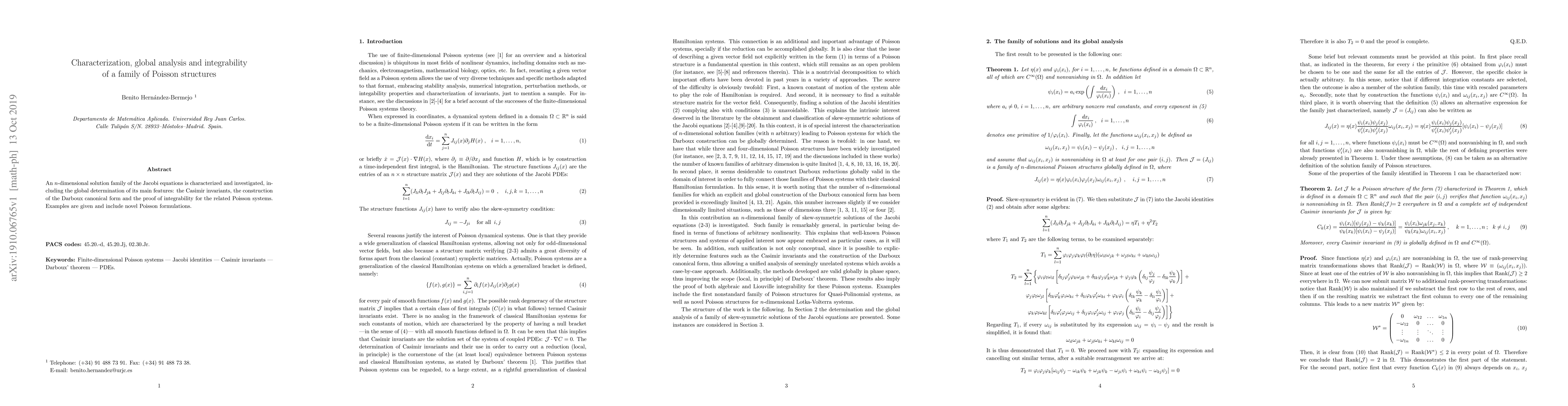 An n-dimensional solution family of the Jacobi equations is characterized and investigated, including the global determination of its main features: the Casimir invariants, the construction of the Darboux canonical form and the proof of integrability for the related Poisson systems. Examples are given and include novel Poisson formulations.