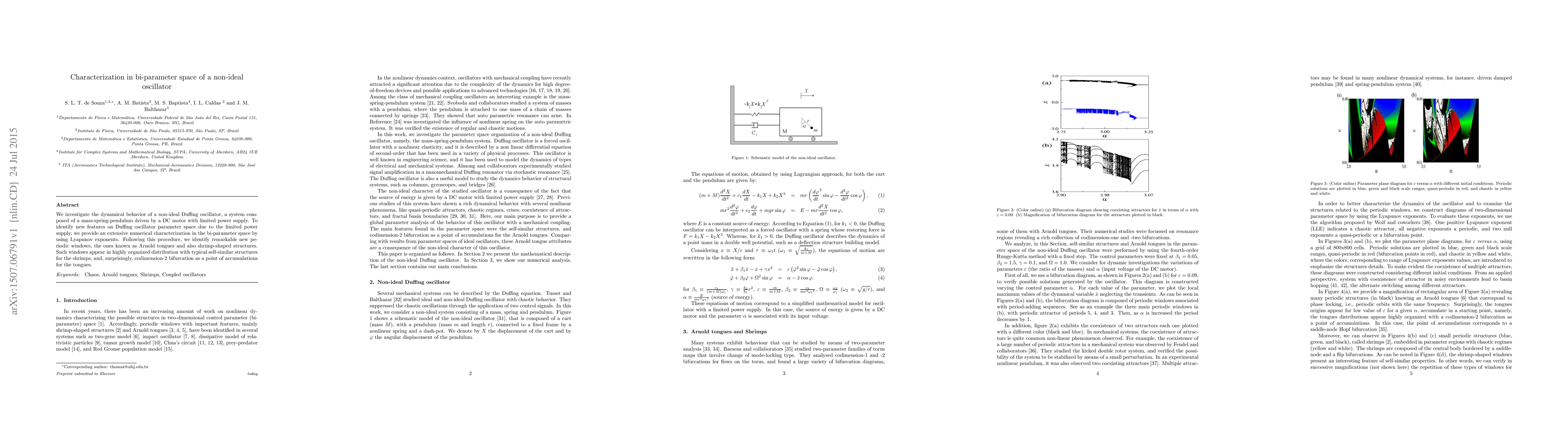 This paper characterizes the dynamical behavior of a non-ideal Duffing oscillator driven by a DC motor with limited power, revealing new periodic windows and shrimp-shaped structures in bi-parameter space using Lyapunov exponents. The study identifies self-similar shrimp structures and codimension-2 bifurcation points as accumulations for the Arnold tongues.