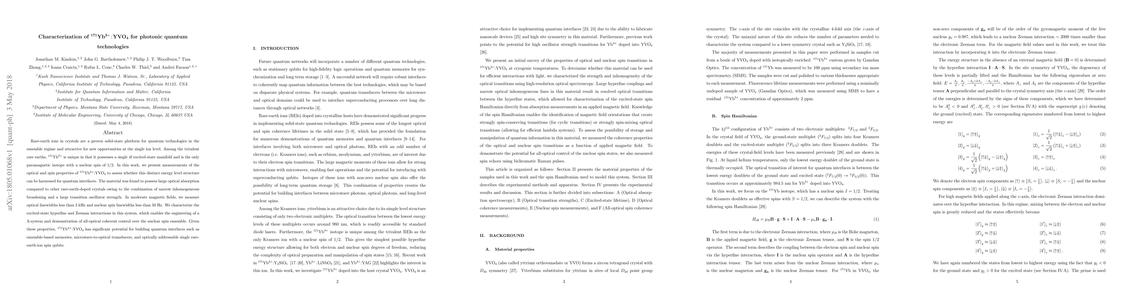 The research characterizes ${}^{171}Yb^{3+}$:YVO$_4$ by measuring its optical and spin properties, including optical absorption spectra, transition strengths, excited-state lifetimes, optical coherence, and nuclear spin measurements. Techniques include optical absorption spectroscopy, fluorescence decay measurements, two-pulse photon echoes (2PPE), and all-optical Ramsey spectroscopy.