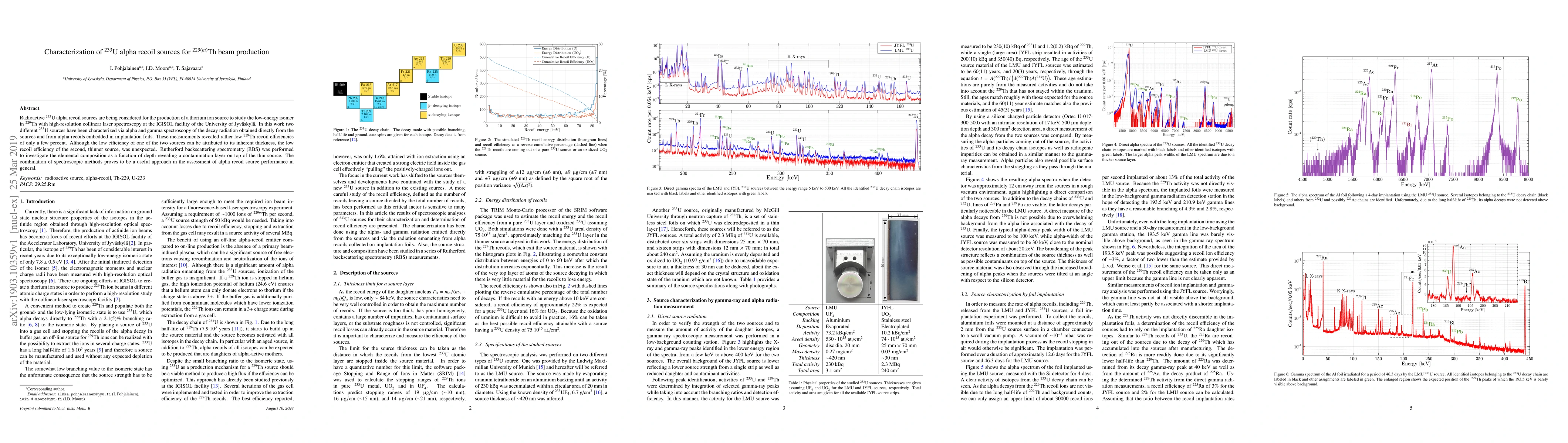 Radioactive $^{233}$U alpha recoil sources are being considered for the production of a thorium ion source to study the low-energy isomer in $^{229}$Th with high-resolution collinear laser spectroscopy at the IGISOL facility of the University of Jyv\"askyl\"a. In this work two different $^{233}$U sources have been characterized via alpha and gamma spectroscopy of the decay radiation obtained directly from the sources and from alpha-recoils embedded in implantation foils. These measurements revealed rather low $^{229}$Th recoil efficiencies of only a few percent. Although the low efficiency of one of the two sources can be attributed to its inherent thickness, the low recoil efficiency of the second, thinner source, was unexpected. Rutherford backscattering spectrometry (RBS) was performed to investigate the elemental composition as a function of depth revealing a contamination layer on top of the thin source. The combination of spectroscopic methods proves to be a useful approach in the assessment of alpha recoil source performance in general.