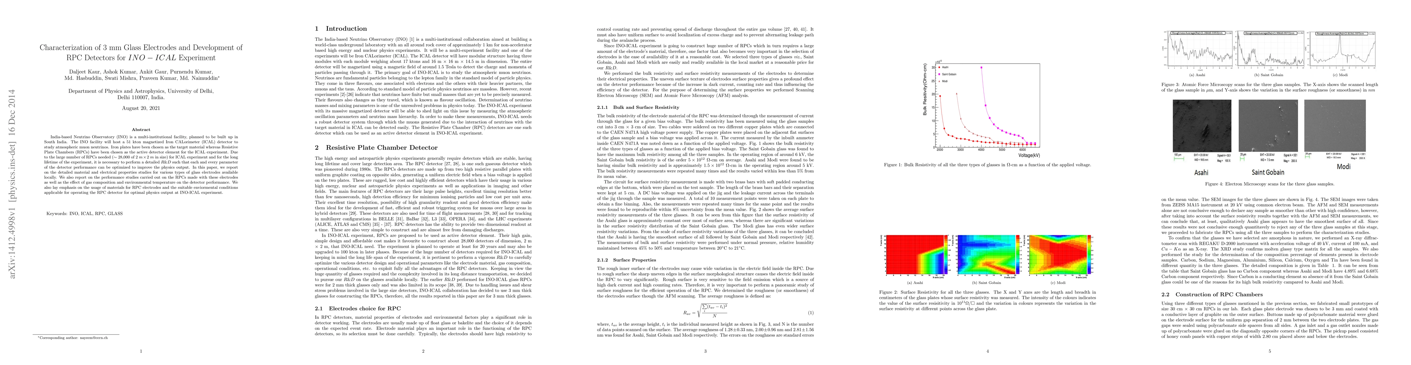 This paper characterizes 3 mm glass electrodes for Resistive Plate Chambers (RPCs) used in the INO-ICAL experiment, detailing their material and electrical properties. It also investigates the performance of RPC detectors, focusing on gas composition and environmental temperature effects to optimize the detector's physics output for the magnetized Iron CALorimeter.