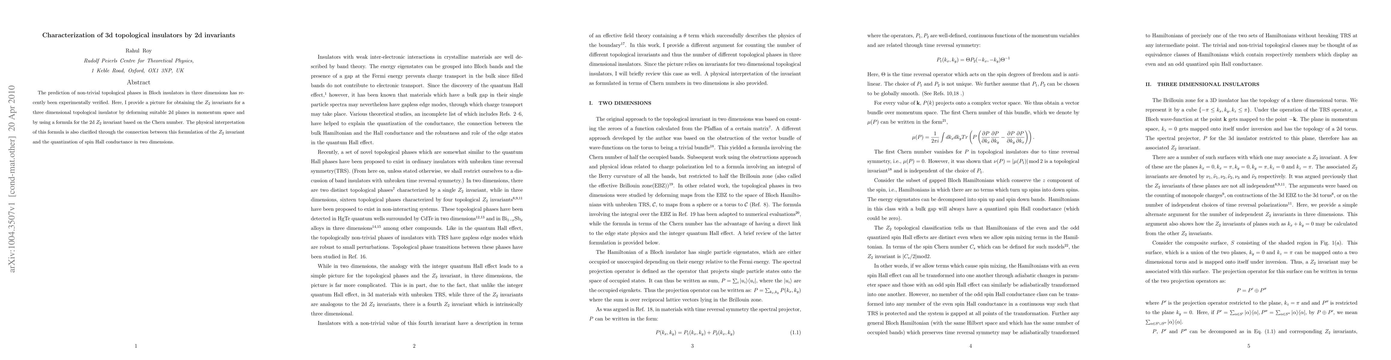 Researchers provide a method to calculate $Z_2$ invariants for 3D topological insulators using 2D planes in momentum space, connecting it to spin Hall conductance. This enables the prediction of non-trivial topological phases in three dimensions.