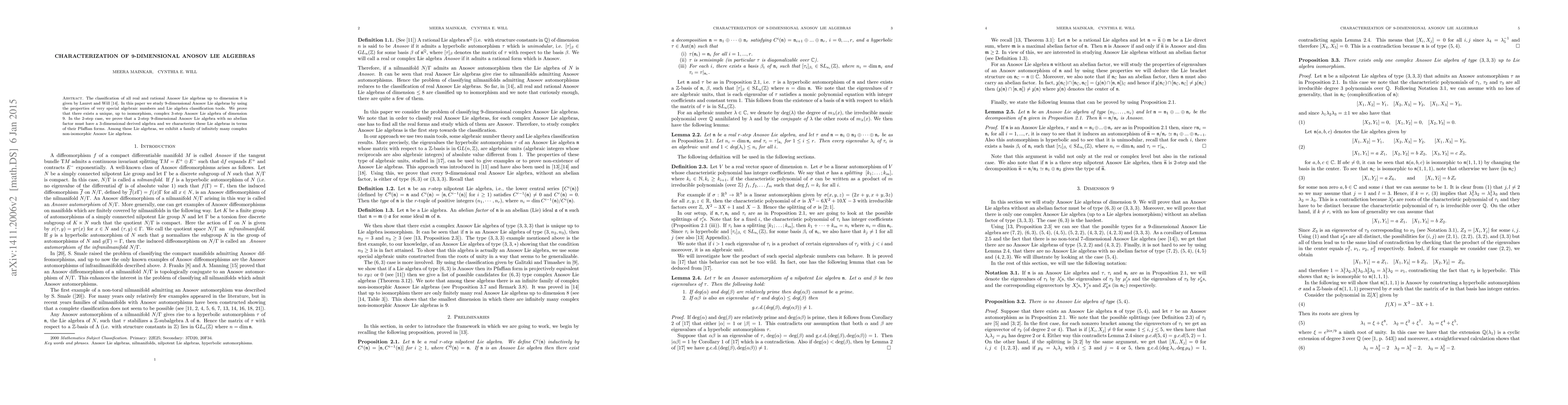 The classification of all real and rational Anosov Lie algebras up to dimension 8 is given by Lauret and Will. In this paper we study 9-dimensional Anosov Lie algebras by using the properties of very special algebraic numbers and Lie algebra classification tools. We prove that there exists a unique (up to a Lie algebra isomorphism) complex 3-step Anosov Lie algebra of dimension 9. In the 2-step case, we prove that a 2-step real 9-dimensional Anosov Lie algebra with no abelian factor must have a 3-dimensional derived algebra and we characterize these Lie algebras in terms of their Pfaffian forms. Among these Lie algebras, we have found a family of infinitely many complex nonisomorphic Anosov Lie algebras.