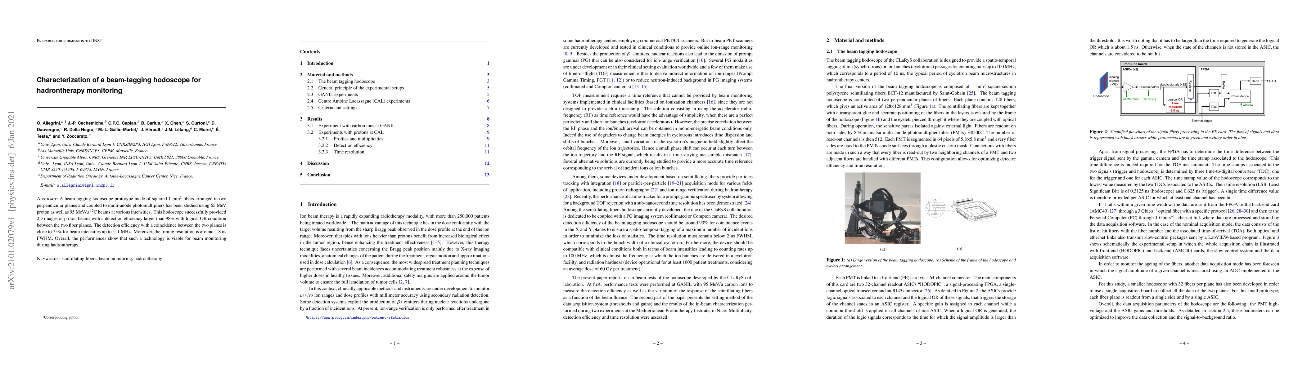 The study characterizes a beam-tagging hodoscope prototype for hadrontherapy monitoring, achieving over 98% detection efficiency with logical OR and nearly 75% with coincidence for proton beams, with a timing resolution of 1.8 ns FWHM, indicating its viability for real-time beam monitoring.