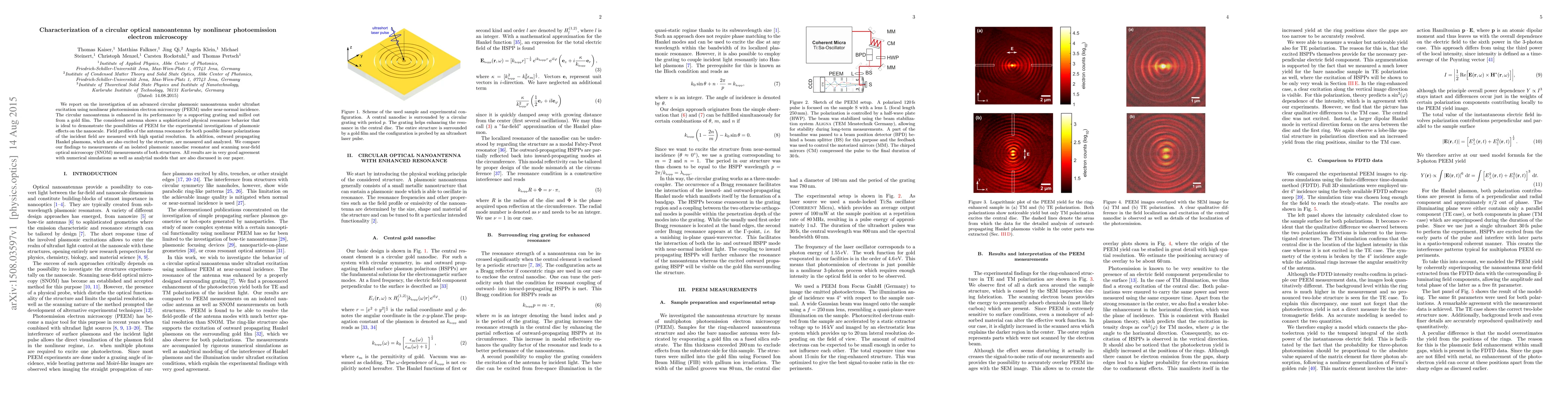 This paper investigates a circular optical nanoantenna using nonlinear photoemission electron microscopy (PEEM) to study its enhanced plasmonic resonance behavior and field profiles under ultrafast excitation. The study reveals outward propagating Hankel plasmons and compares the results with numerical simulations and other microscopy techniques.