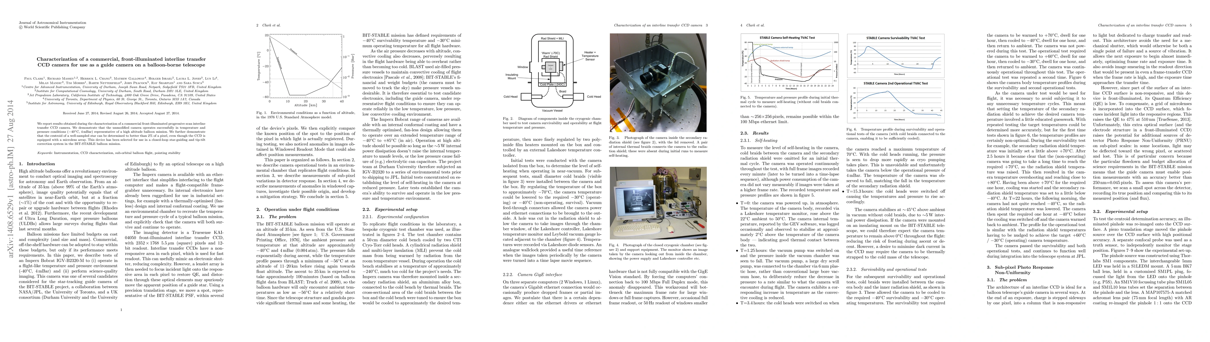 We report results obtained during the characterization of a commercial front-illuminated progressive scan interline transfer CCD camera. We demonstrate that the unmodified camera operates successfully in temperature and pressure conditions (-40C, 4mBar) representative of a high altitude balloon mission. We further demonstrate that the centroid of a well-sampled star can be determined to better than 2% of a pixel, even though the CCD is equipped with a microlens array. This device has been selected for use in a closed-loop star-guiding and tip-tilt correction system in the BIT-STABLE balloon mission.