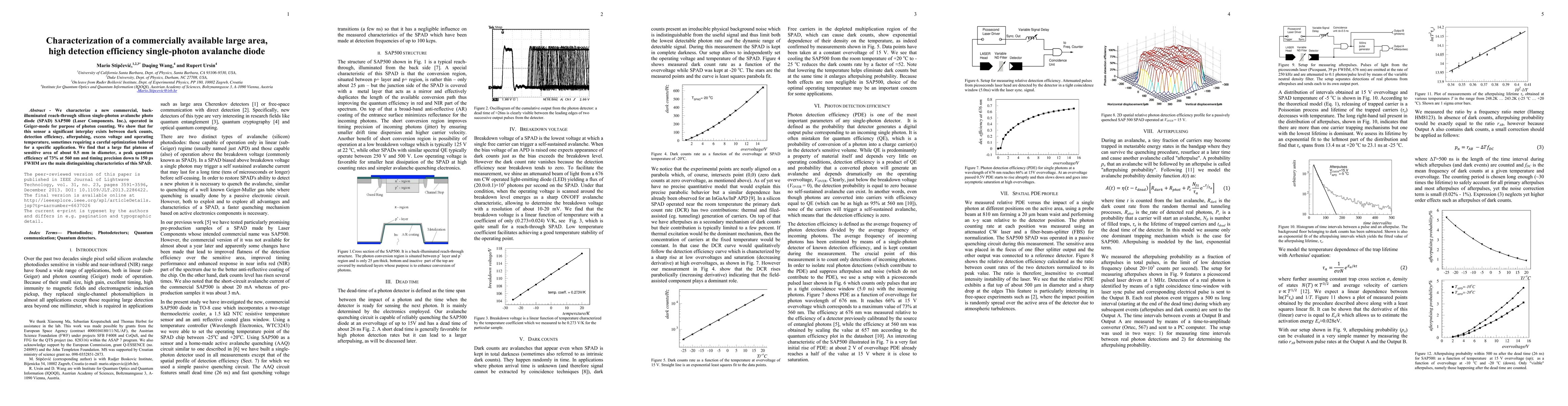 This paper characterizes a commercial silicon single-photon avalanche diode (SPAD) operated in Geiger-mode, highlighting its significant interplay between dark counts, detection efficiency, and other factors. The SPAD exhibits a large sensitive area, peak quantum efficiency of 73% at 560 nm, and timing precision down to 150 ps FWHM.
