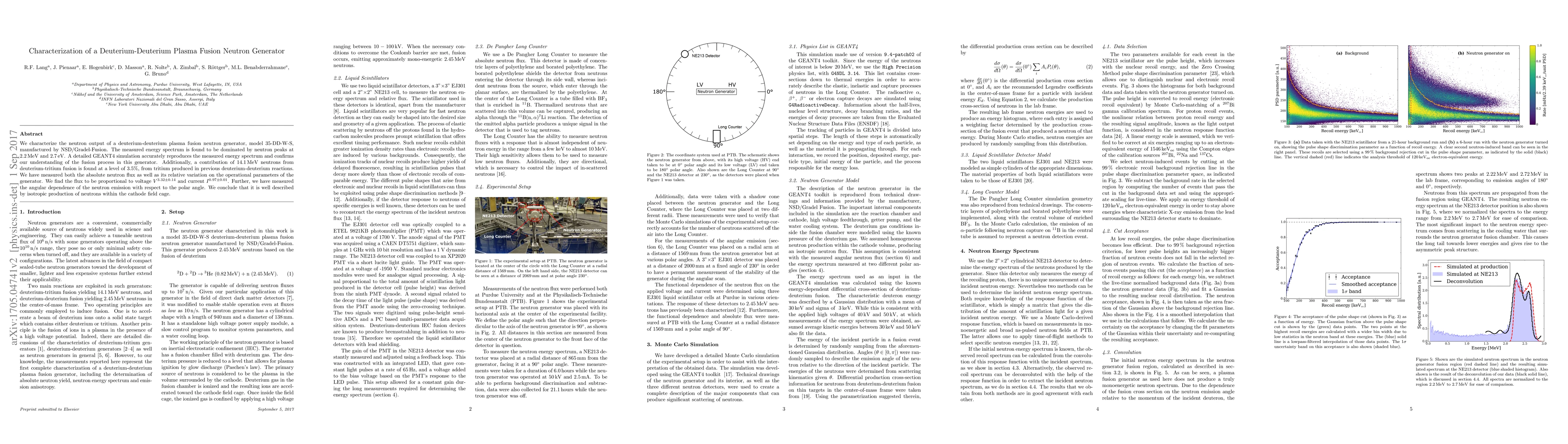This paper characterizes a deuterium-deuterium plasma fusion neutron generator, finding dominant neutron peaks at 2.2 MeV and 2.7 MeV, with a 3.5% contribution from deuterium-tritium fusion. The neutron flux is proportional to voltage and current, and the emission is isotropic.