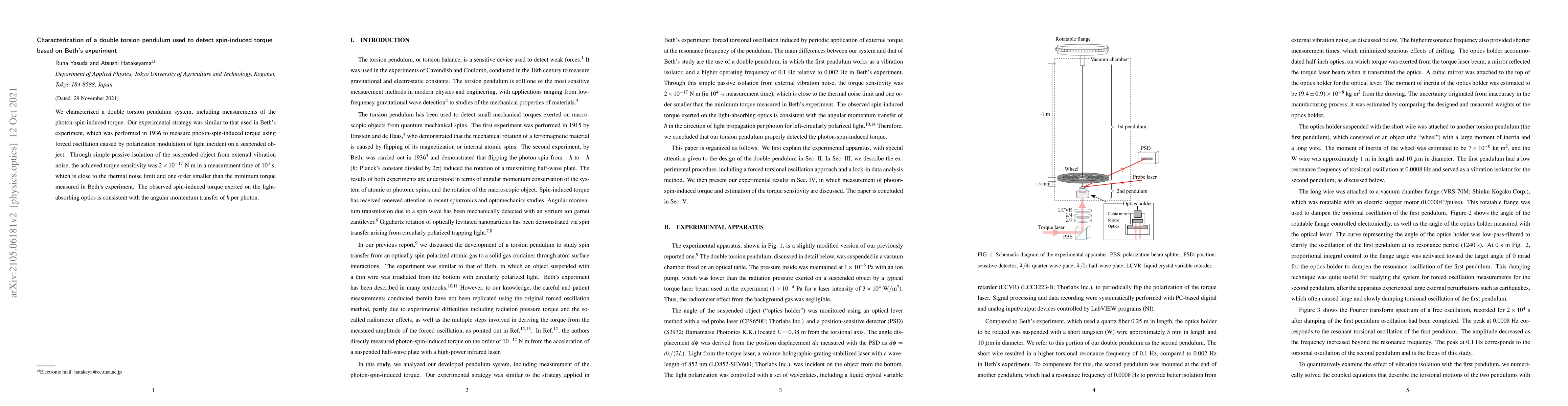 This paper characterizes a double torsion pendulum system to detect photon-spin-induced torque, achieving a torque sensitivity of 2 x 10^-17 N m, surpassing Beth's 1936 experiment by an order of magnitude. The results align with the predicted angular momentum transfer of hbar per photon.