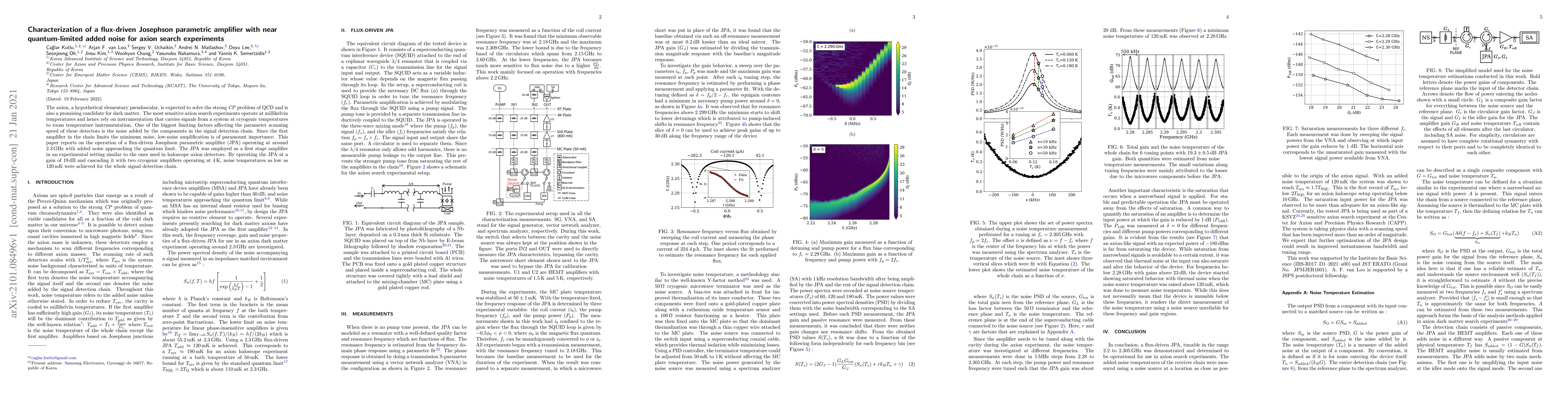 This paper characterizes a flux-driven Josephson parametric amplifier (JPA) operating near the quantum-limited noise level, designed for enhancing the sensitivity of axion search experiments. The JPA achieved a gain of 19 dB and, when combined with cryogenic amplifiers, resulted in an overall noise temperature of 120 mK, significantly improving the detection capabilities of axion detectors.
